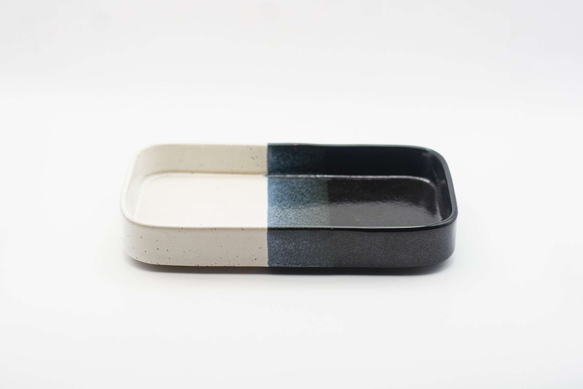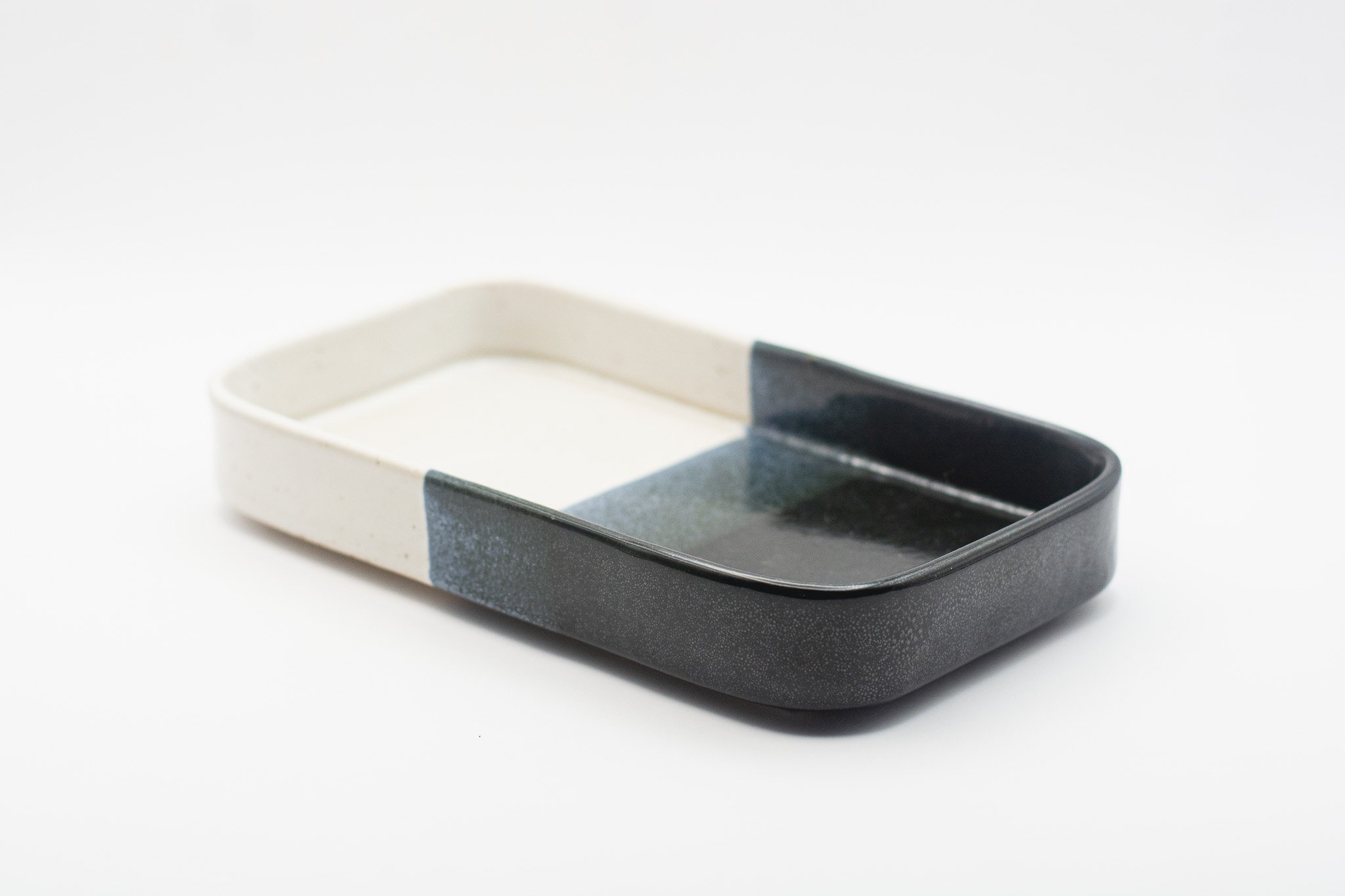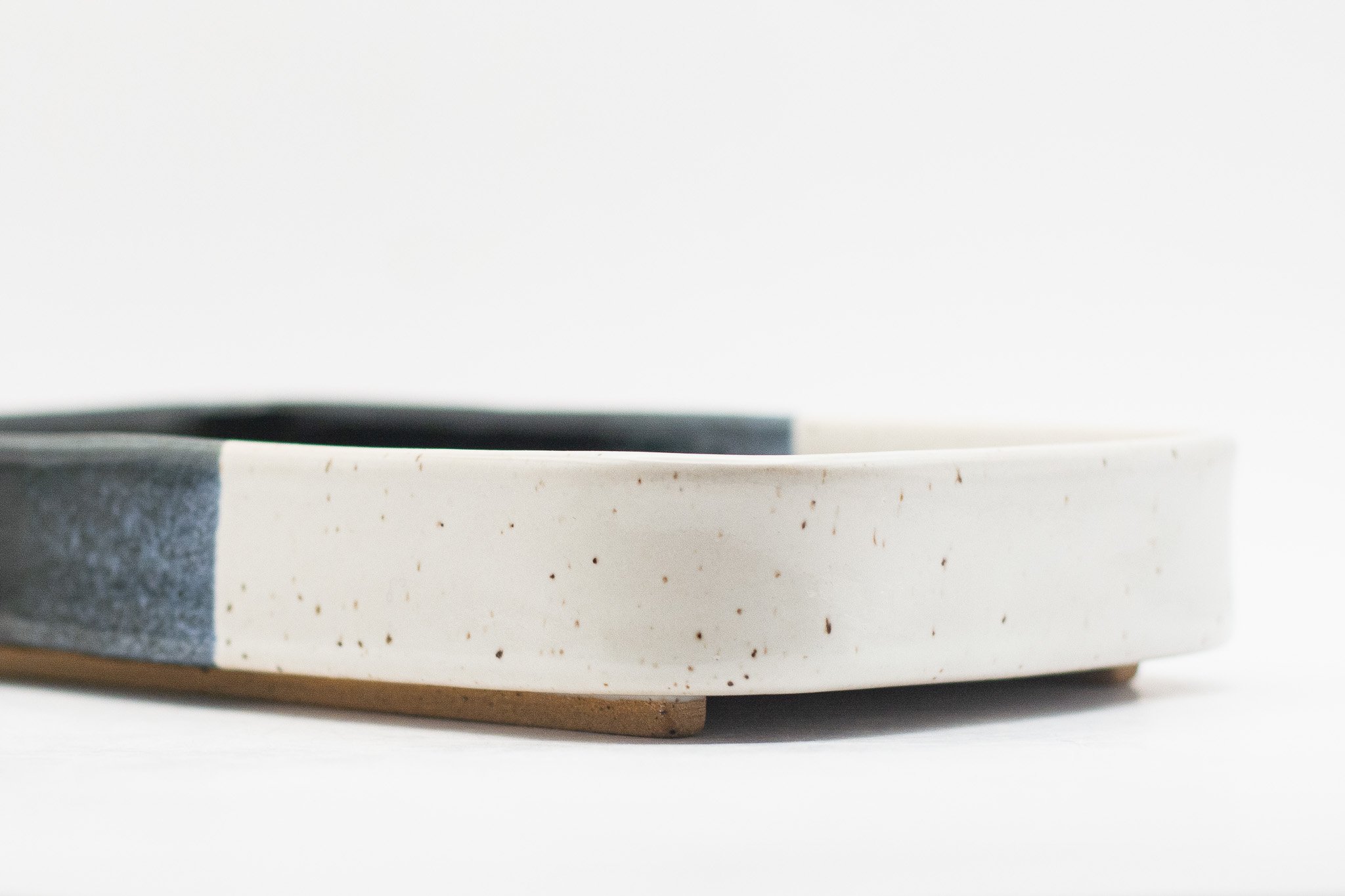 A medium sized ceramic tray characterized by its rounded corners, tall vertical rim, black and white overlapping glazes and tall foot. It could be used for many different purposes, such as serving food, storing bathroom products, organizing stationary or anything else that would benefit from its tall walls!