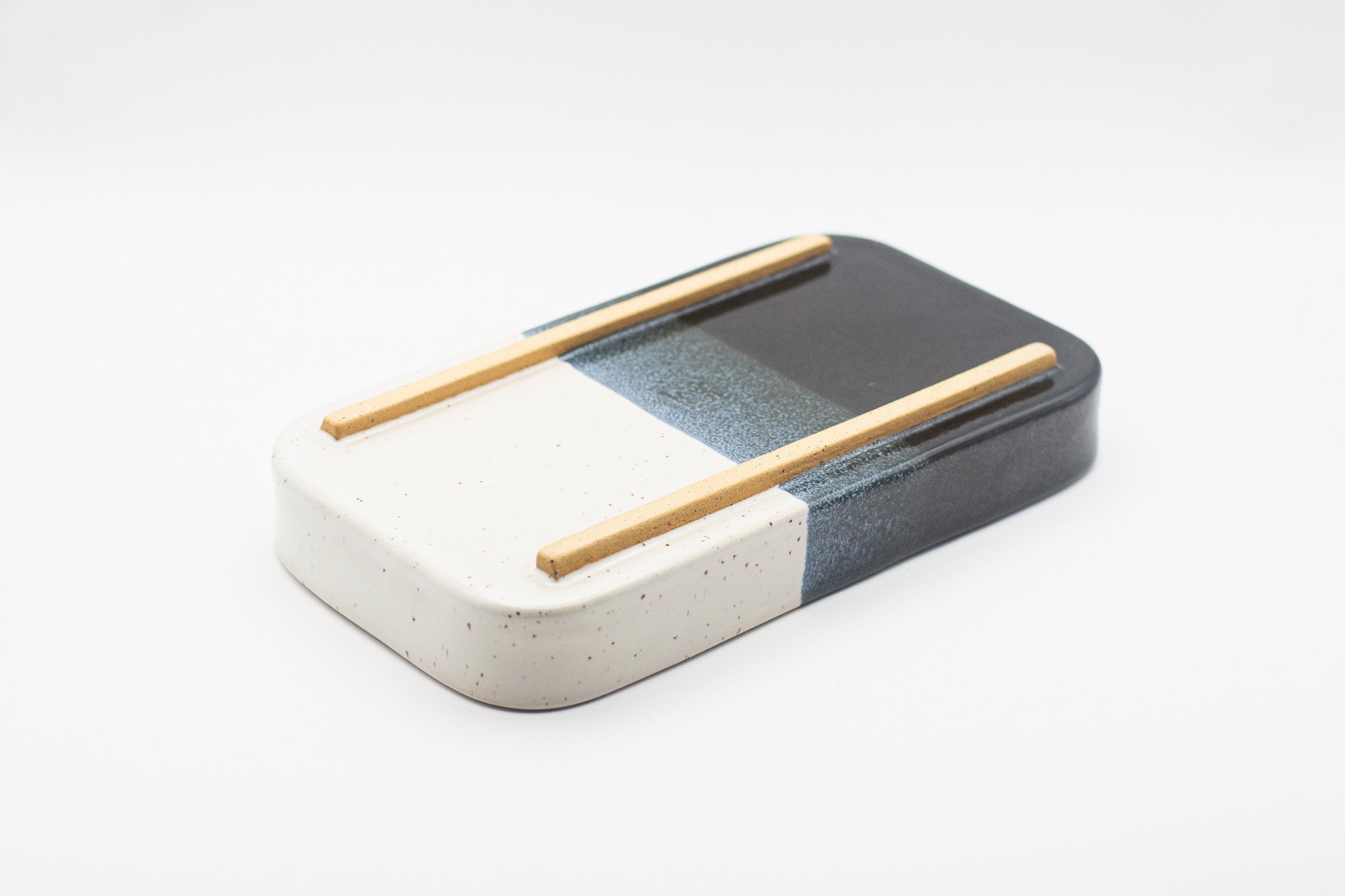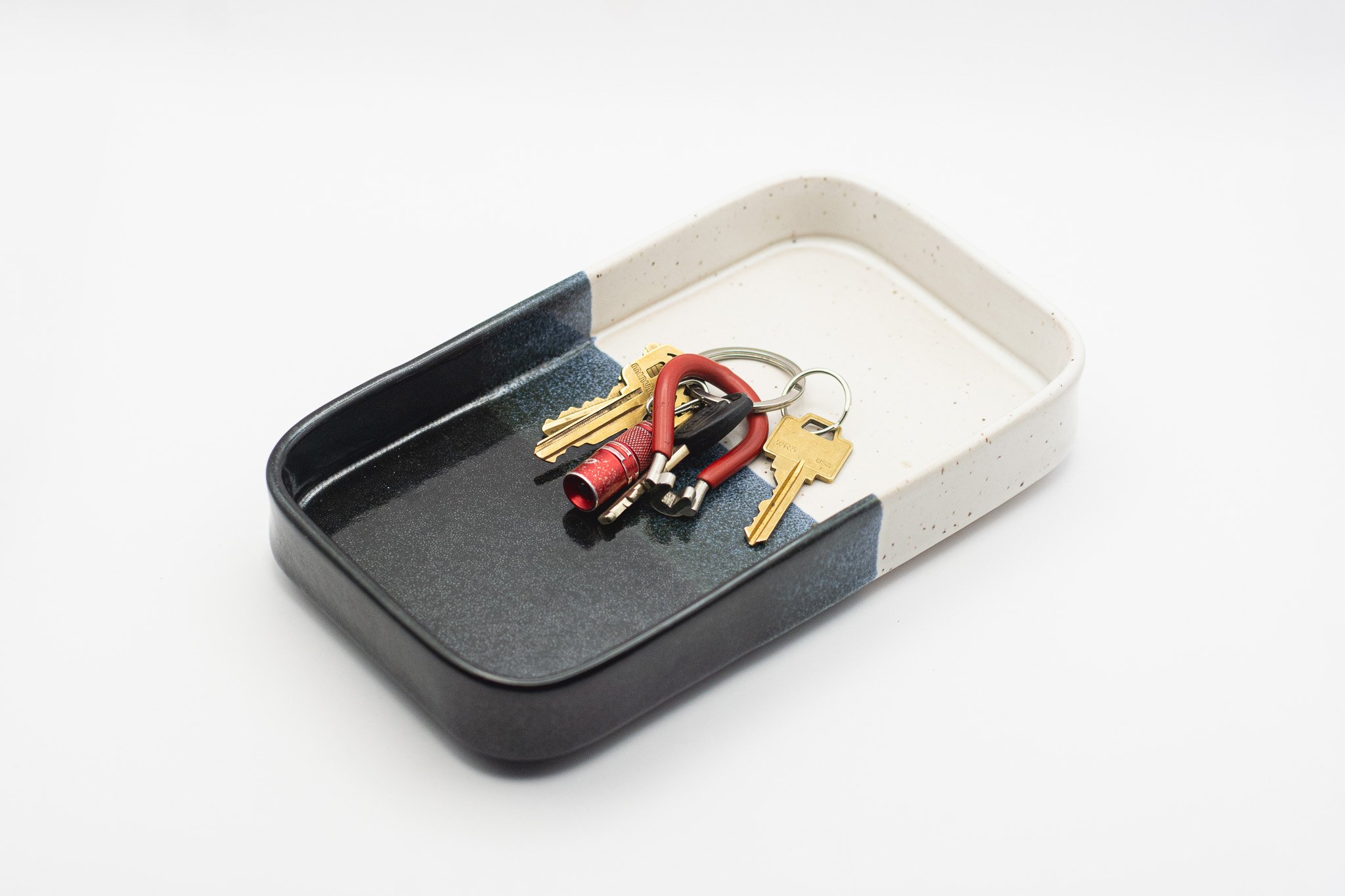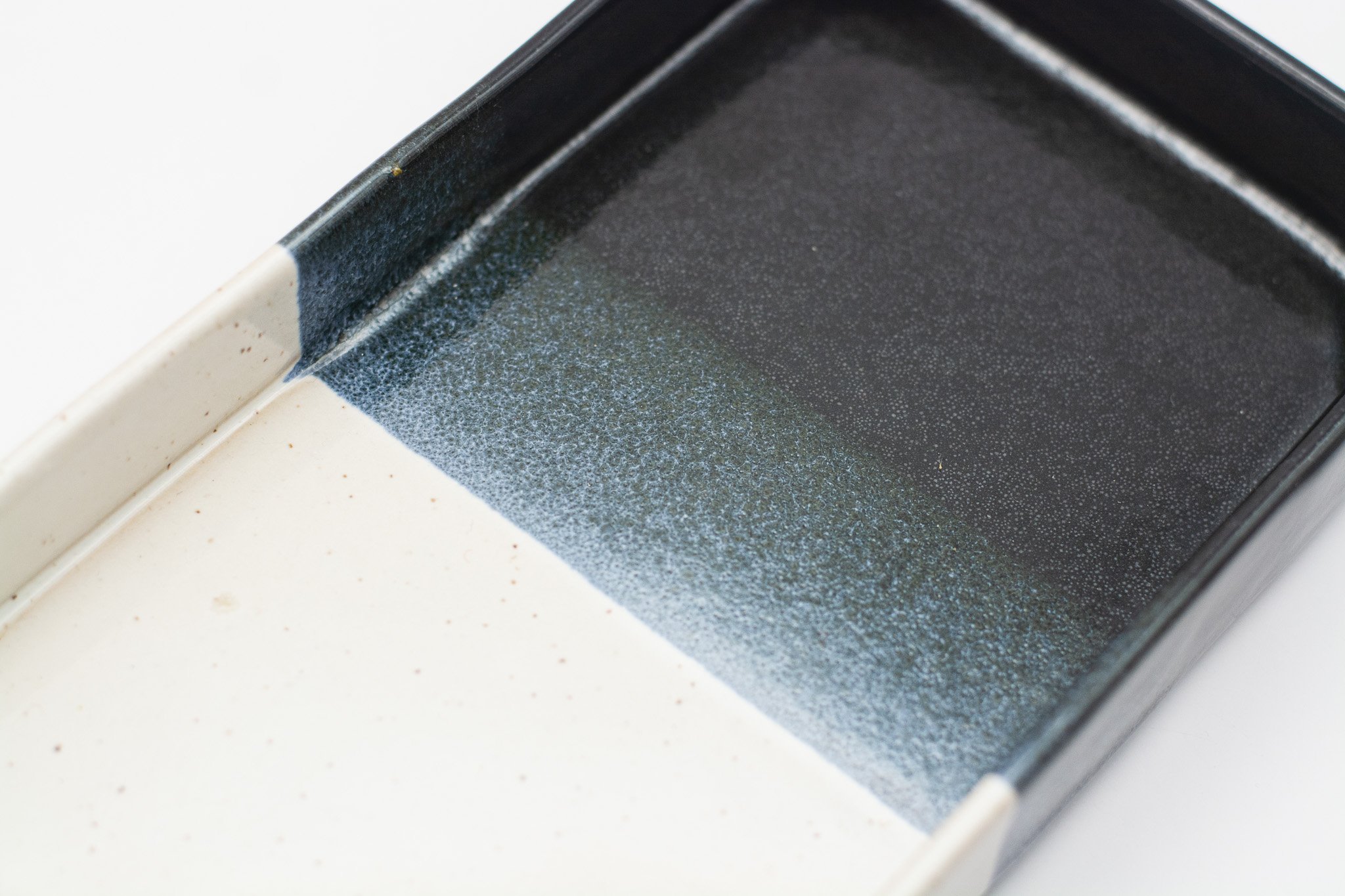 A medium sized ceramic tray characterized by its rounded corners, tall vertical rim, black and white overlapping glazes and tall foot. It could be used for many different purposes, such as serving food, storing bathroom products, organizing stationary or anything else that would benefit from its tall walls!