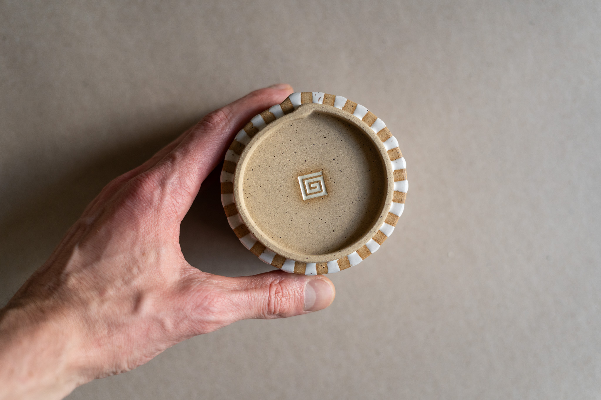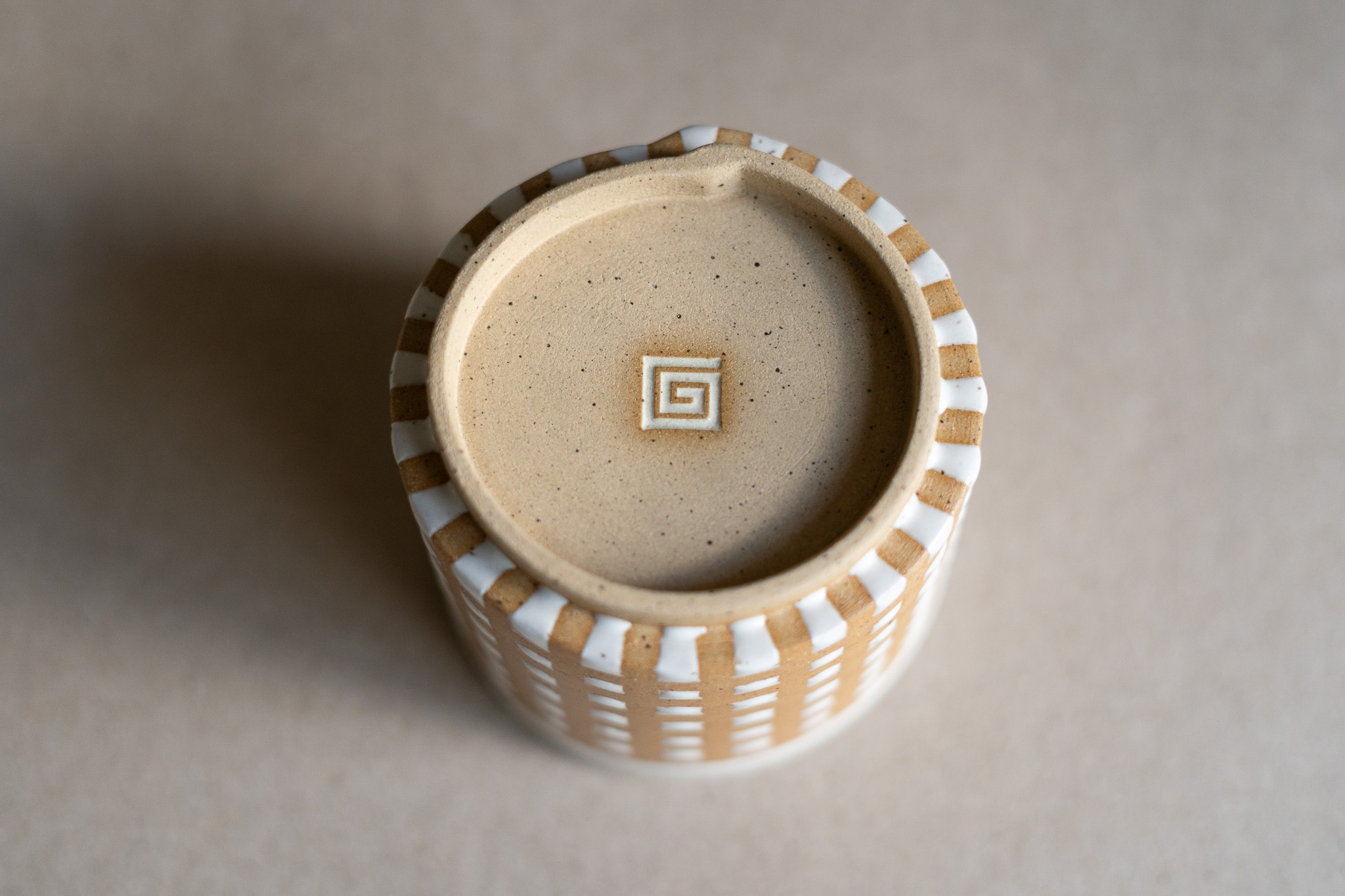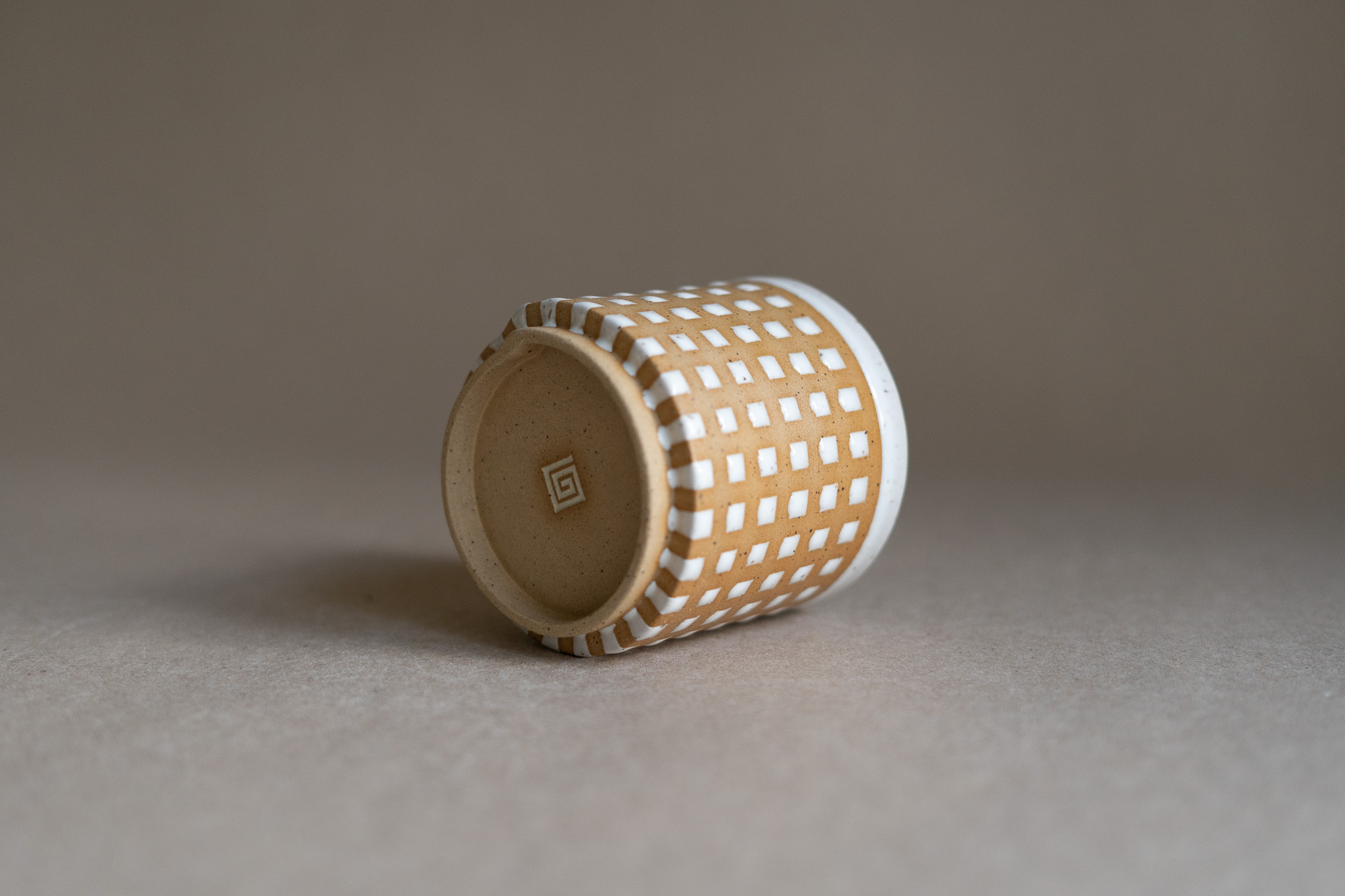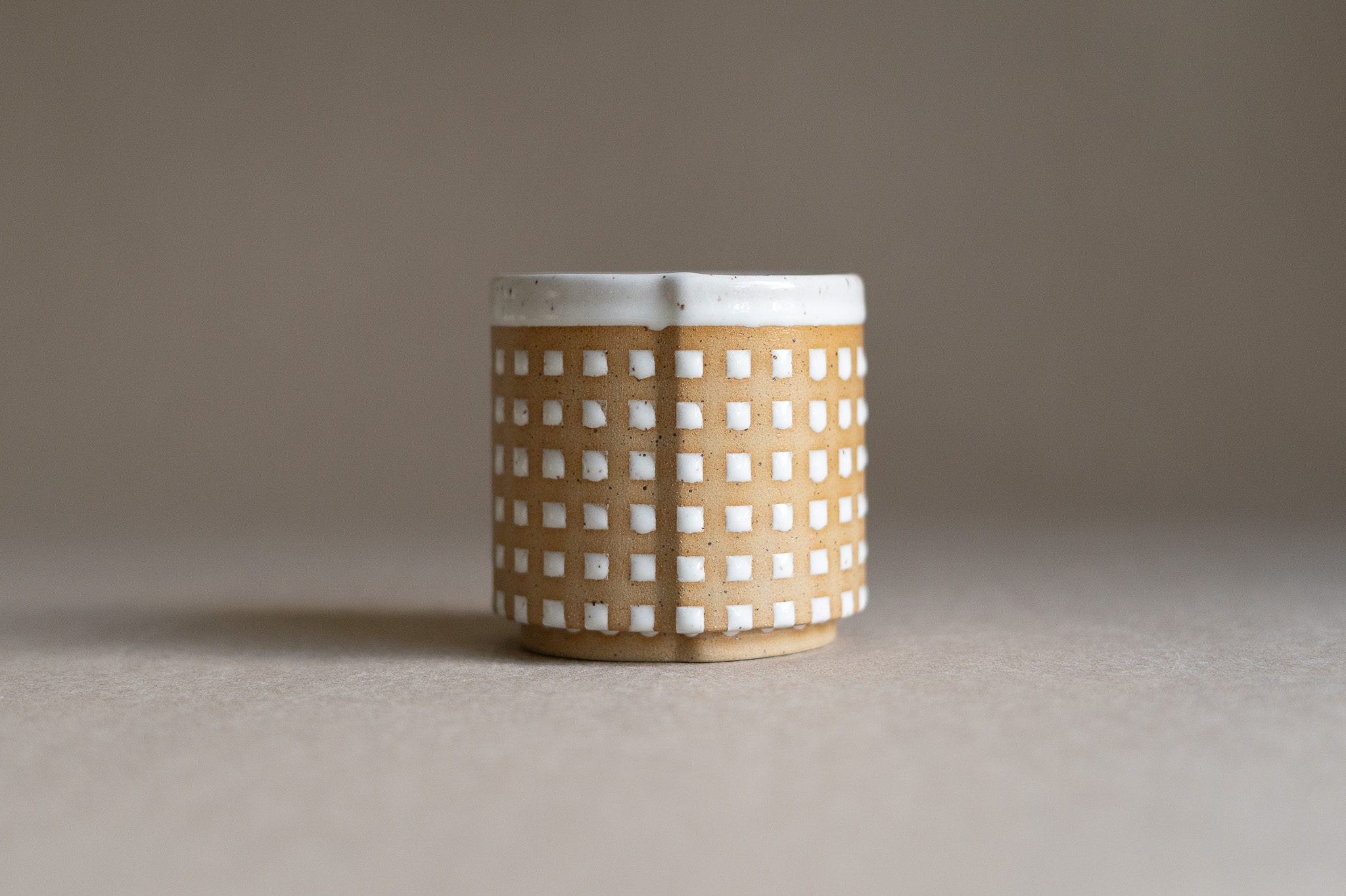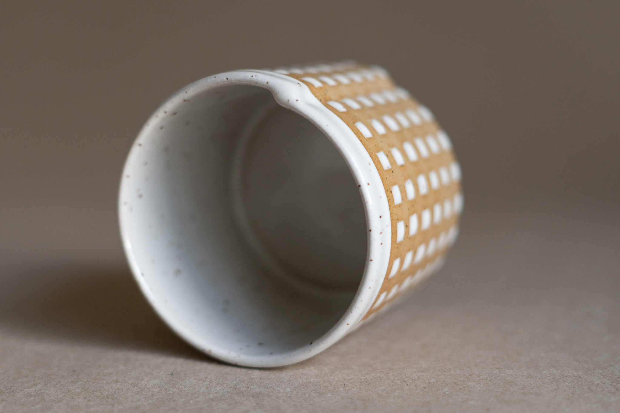 A large tumbler with a tactile glossy white grid pattern on raw speckled clay. The edges of glazed sections have a toasted “halo” effect, thanks to the flashing that occurred in the kiln. It features a prominent overlapping seam and tall foot ring.