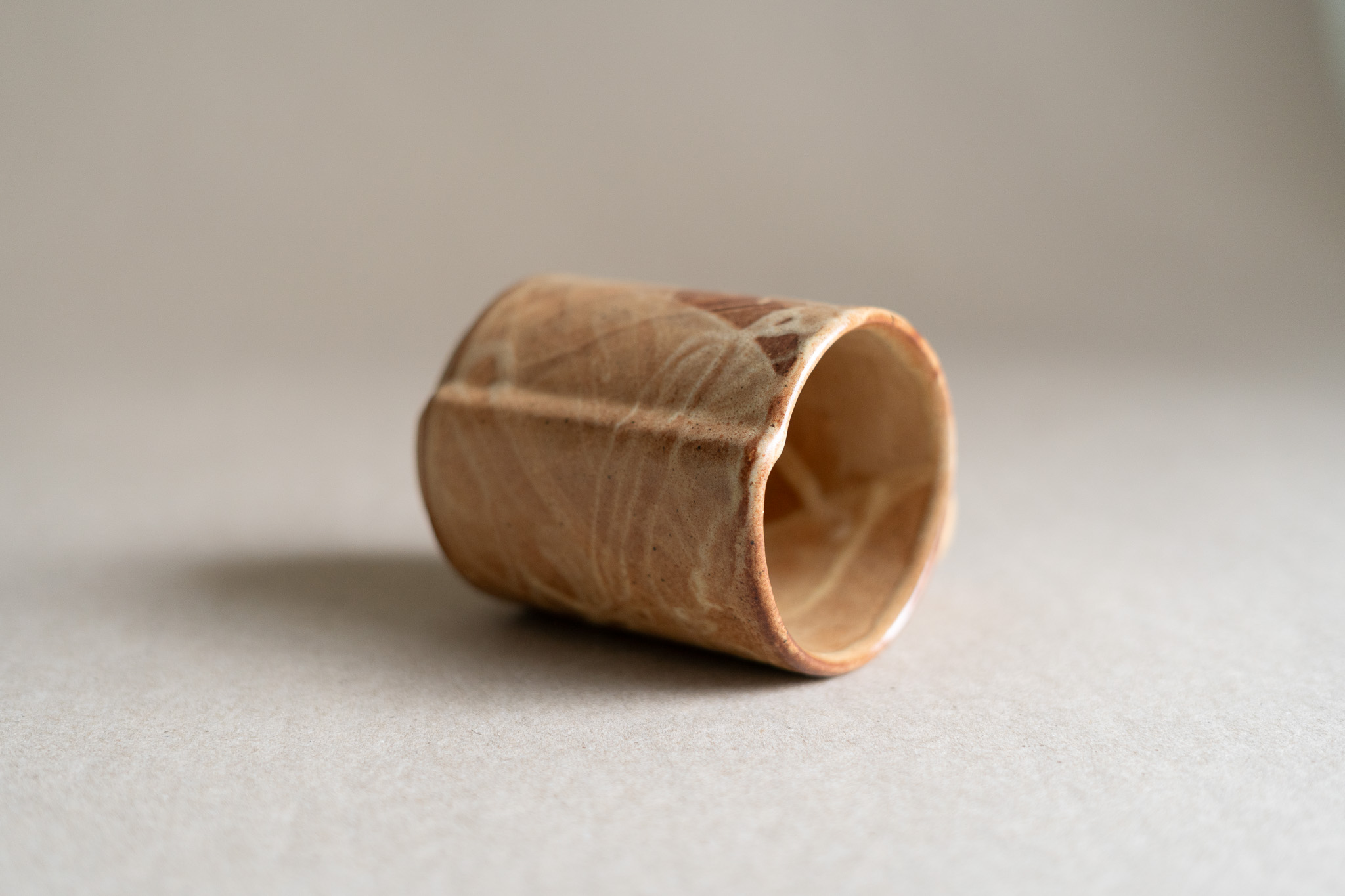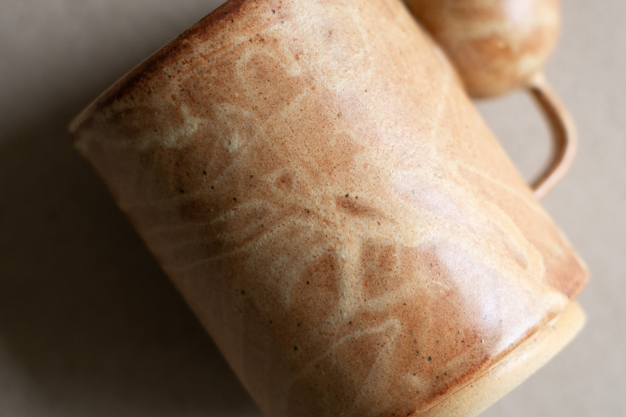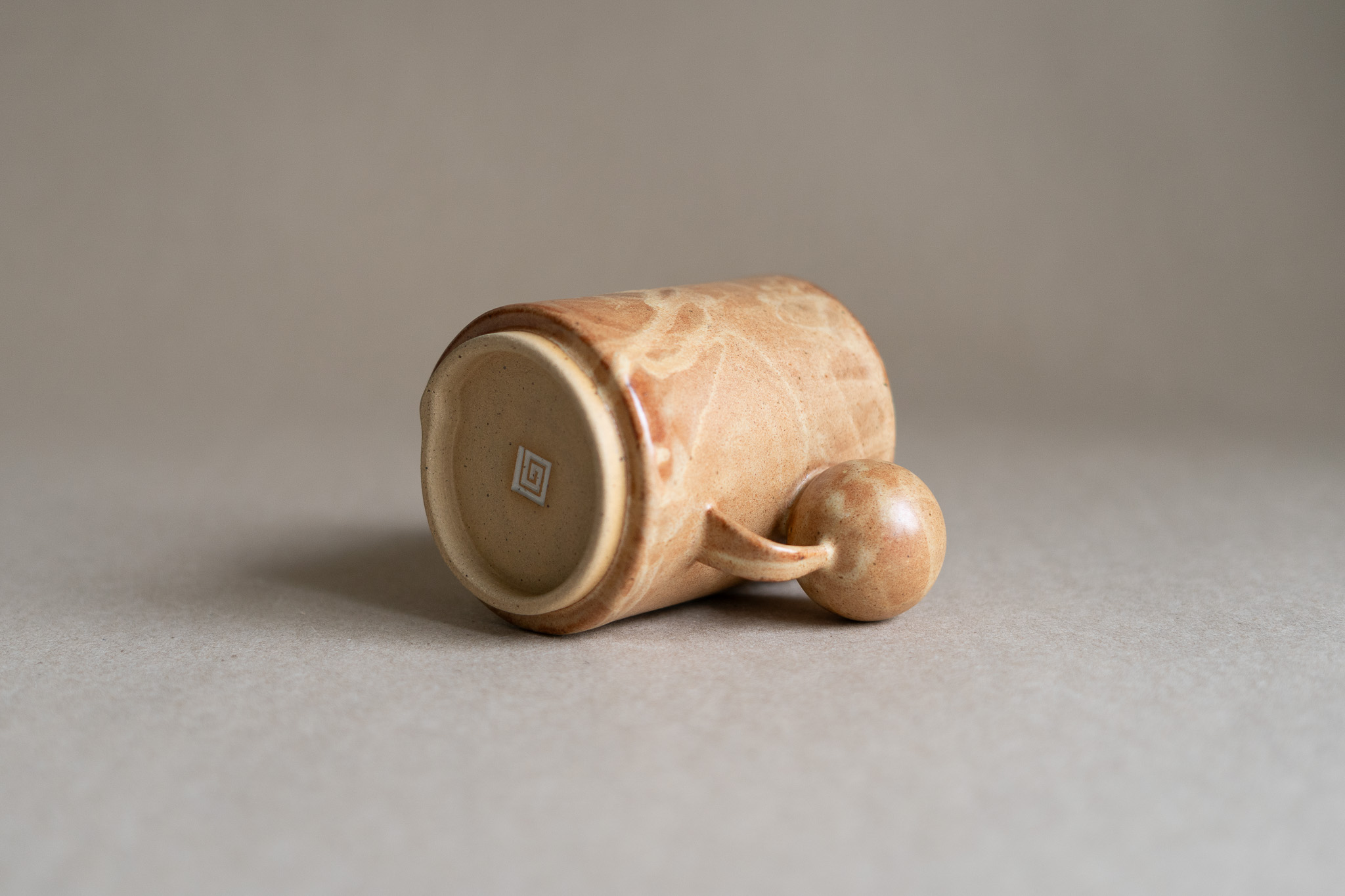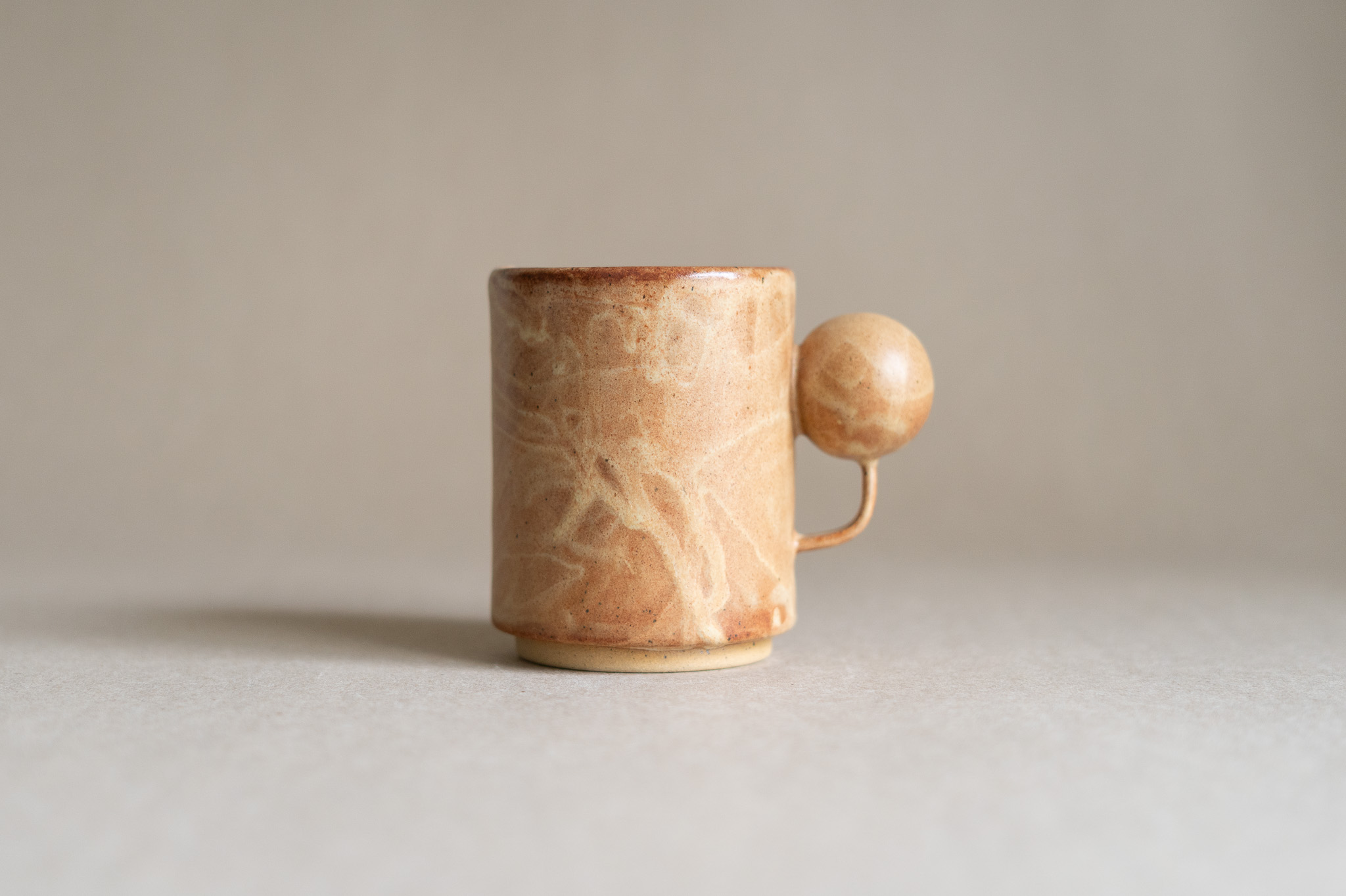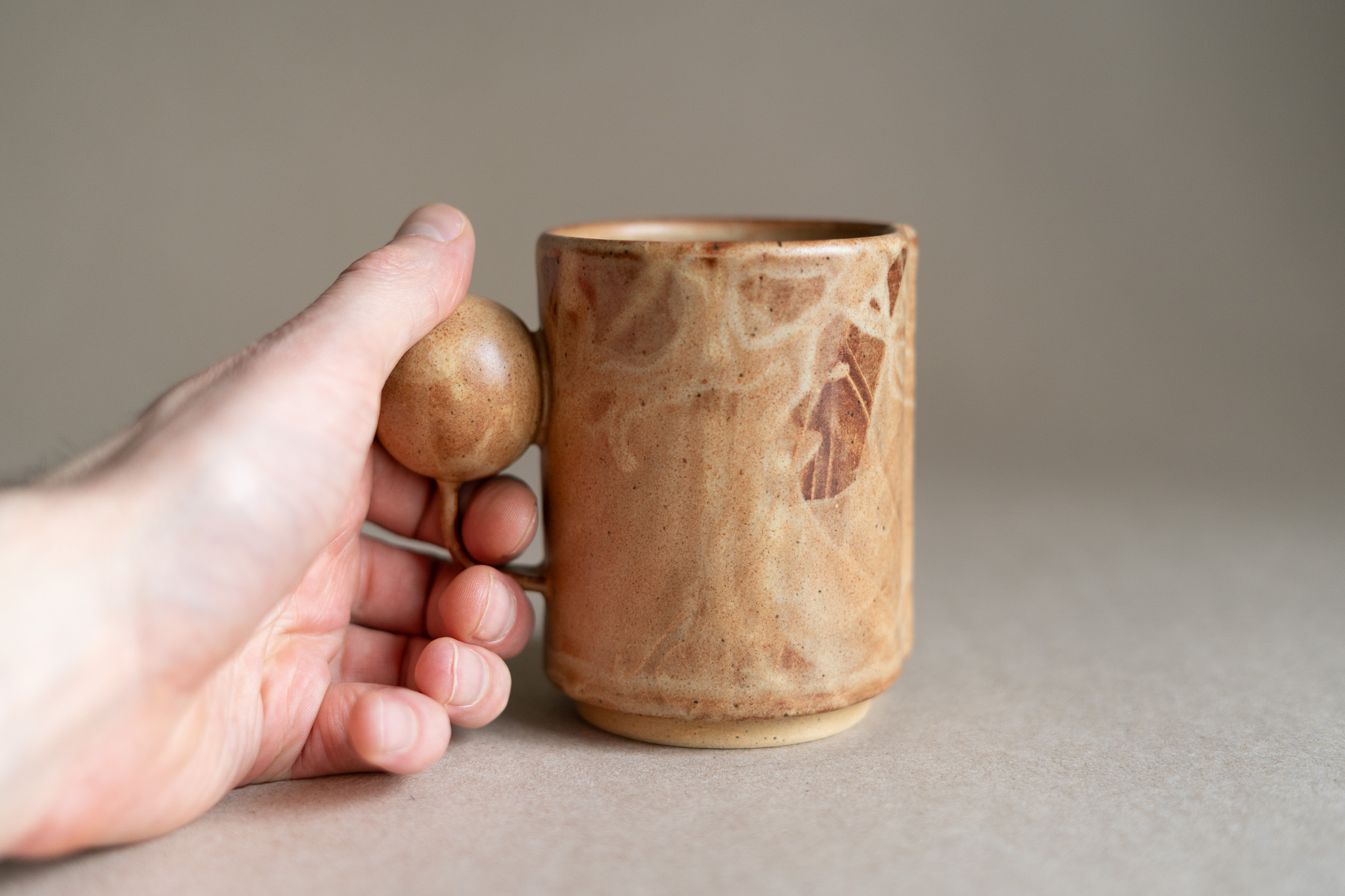 A medium sized mug characterized by its hollow spherical handle, speckled clay body, overlapping seam and tall foot ring. The layered application of the nutty-coloured glaze gives it a leathery appearance.