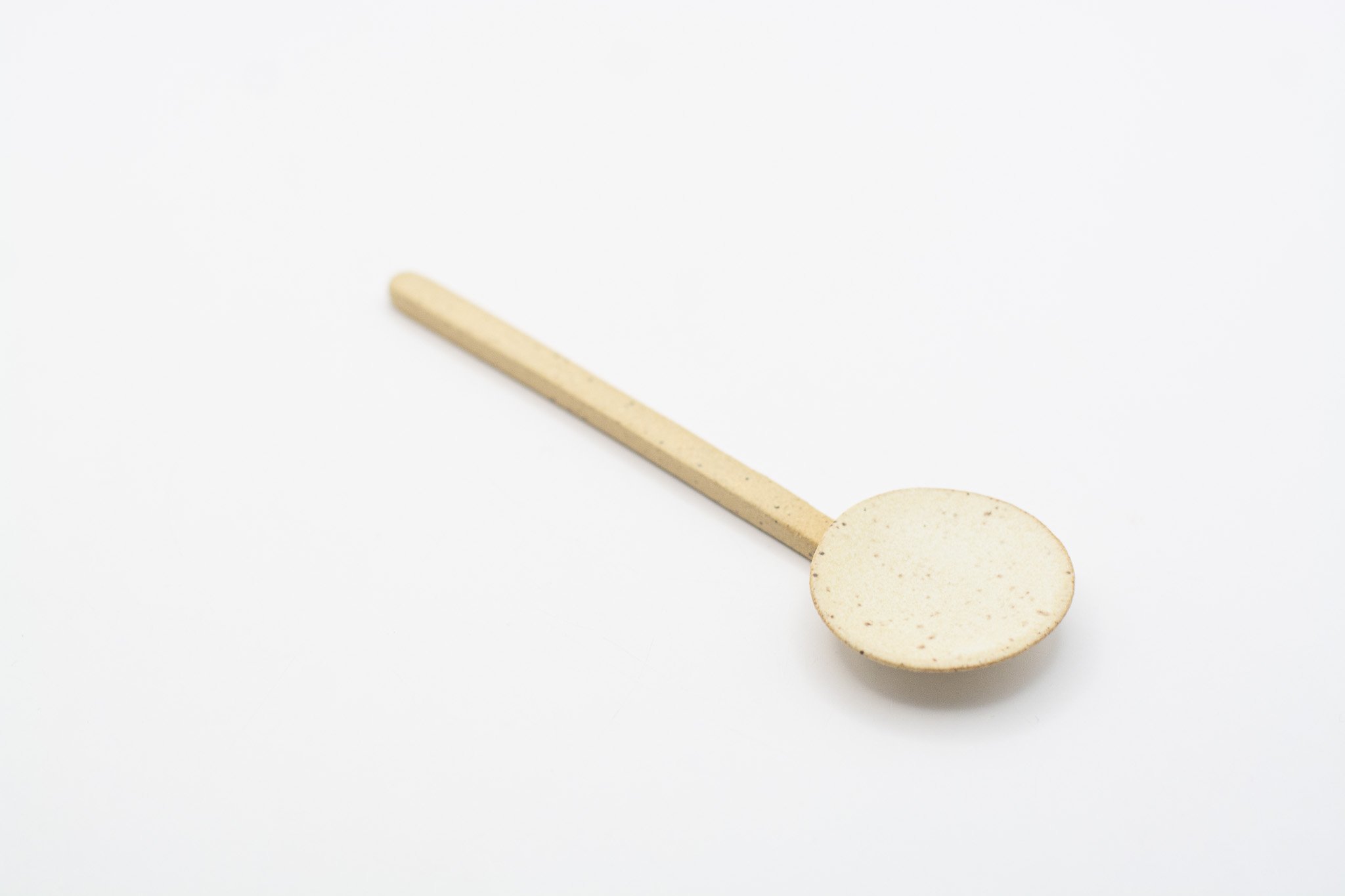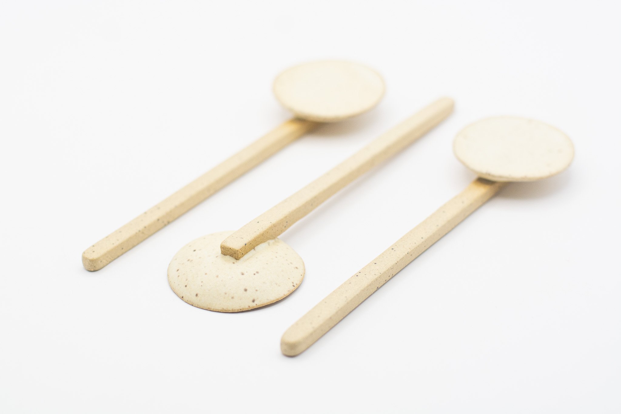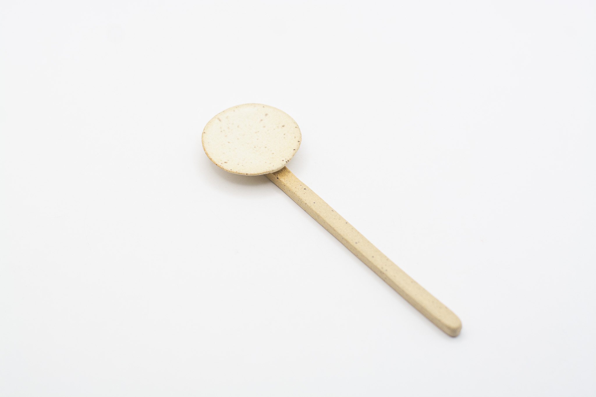 These little sugar spoons are characterized by their matte white galze, unglazed handle and speckled clay body. Listed price is for a single spoon.