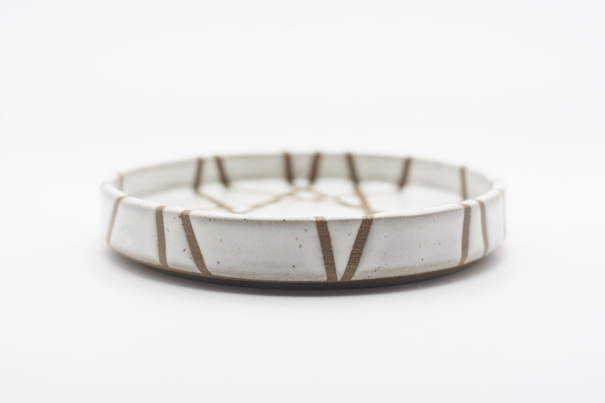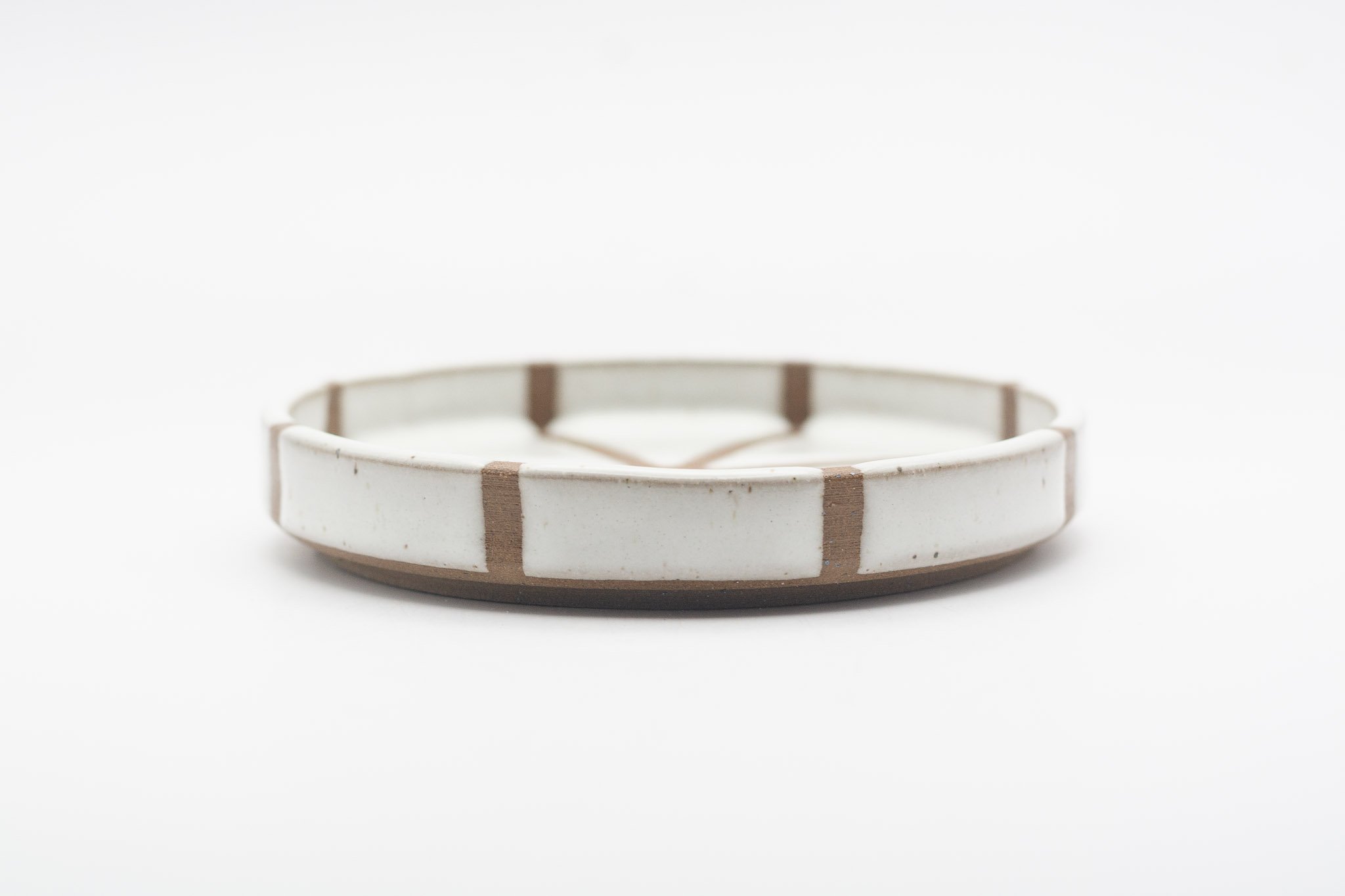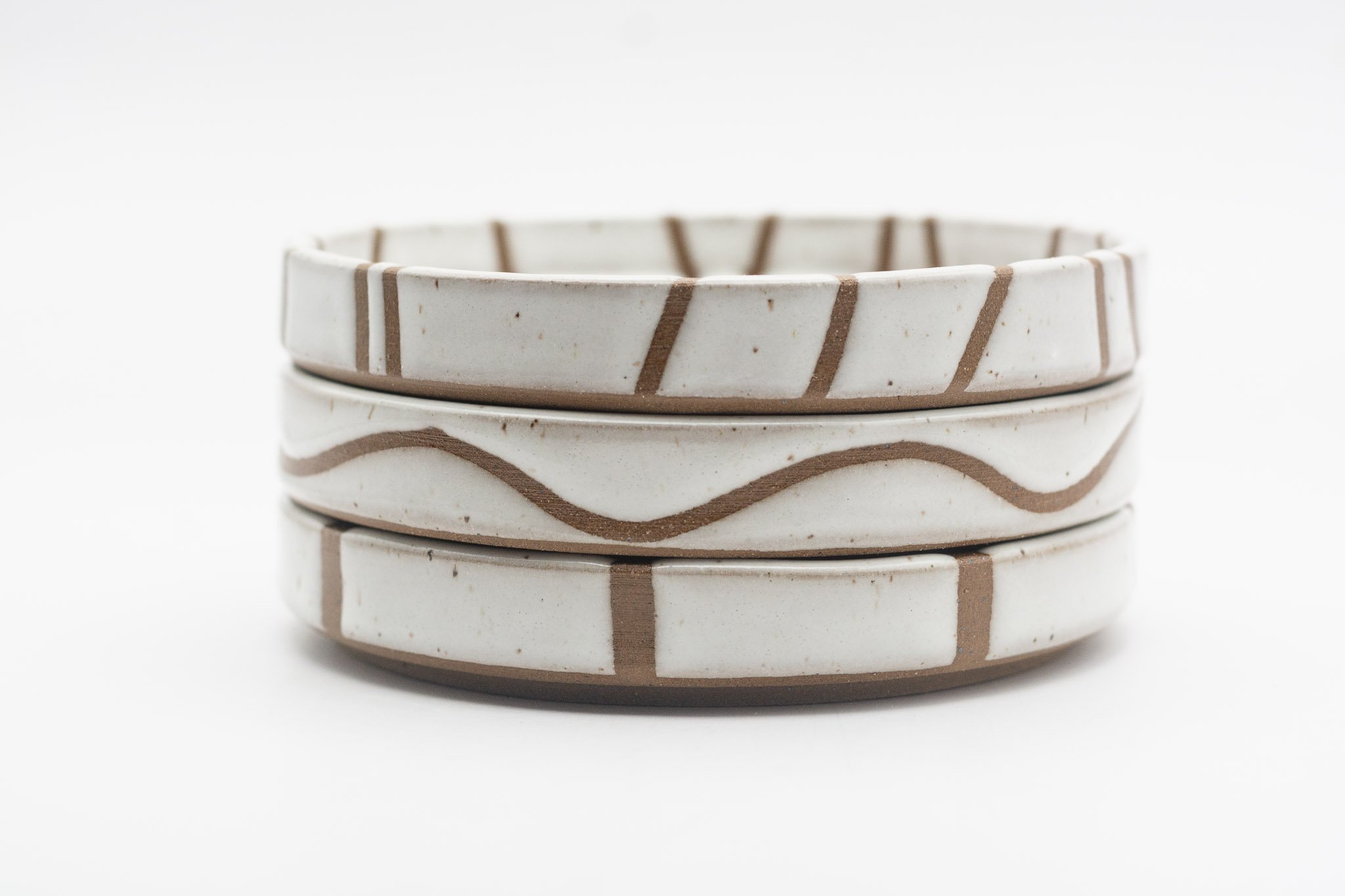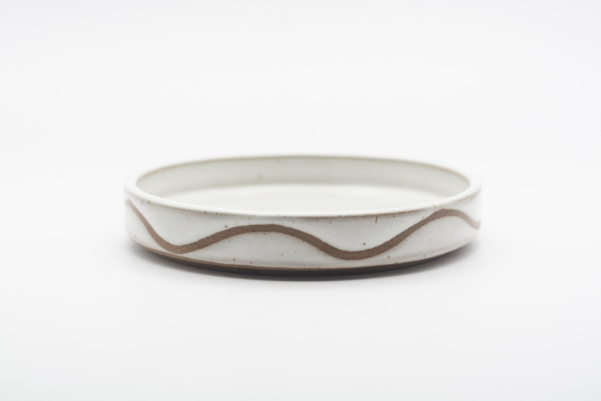 This series of small side plates featuring 3 different glaze patterns, which expose sections of the raw, chocolate brown coloured clay. The vertical walls make this a versatile vessel for your favourite snack, trinkets or loose household items, such as your keys. Each plate has a foot ring, giving them a levitating effect.