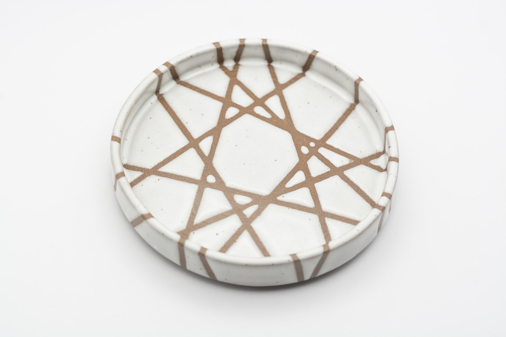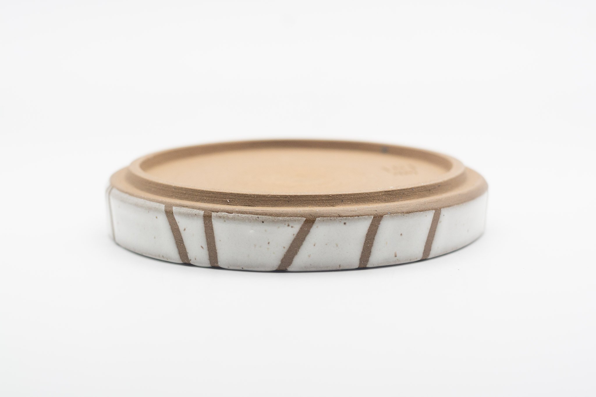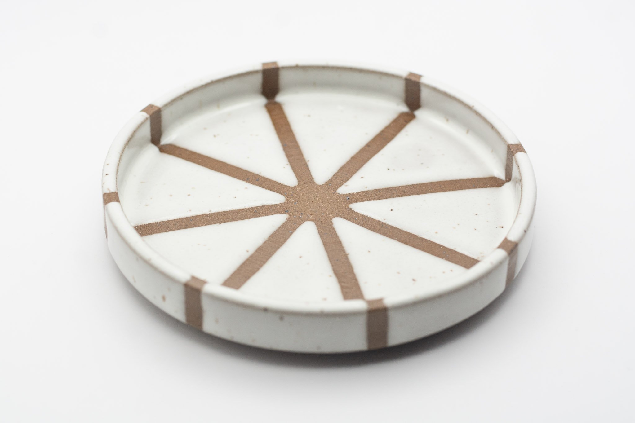 This series of small side plates featuring 3 different glaze patterns, which expose sections of the raw, chocolate brown coloured clay. The vertical walls make this a versatile vessel for your favourite snack, trinkets or loose household items, such as your keys. Each plate has a foot ring, giving them a levitating effect.