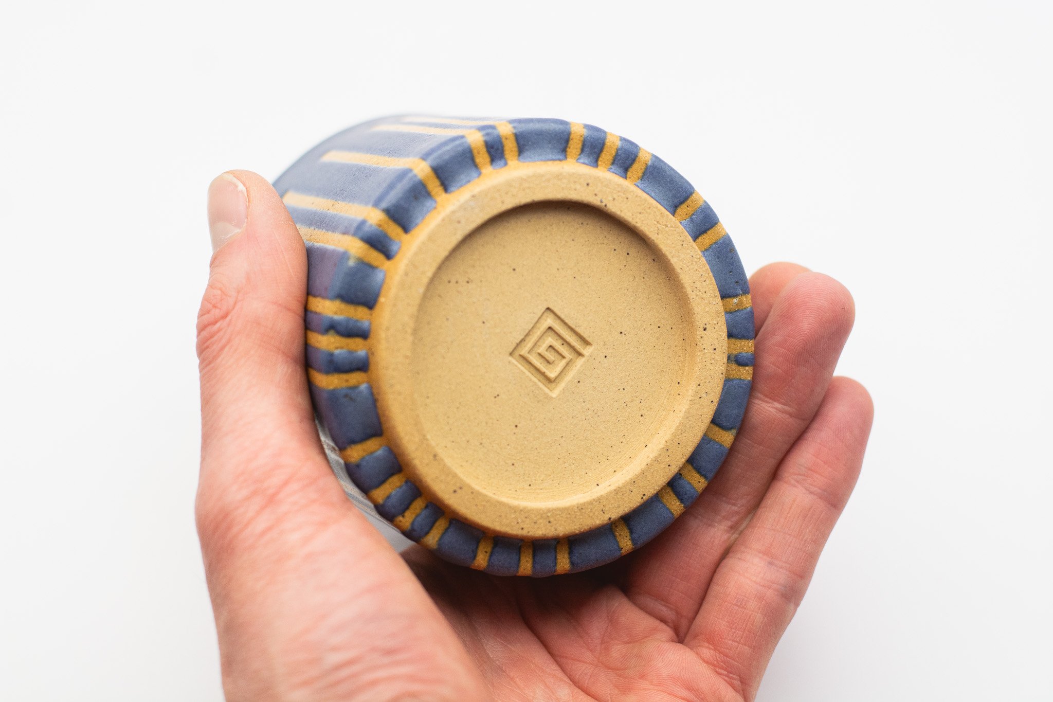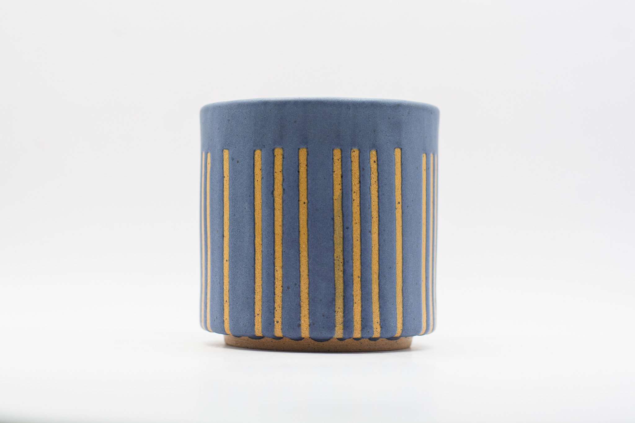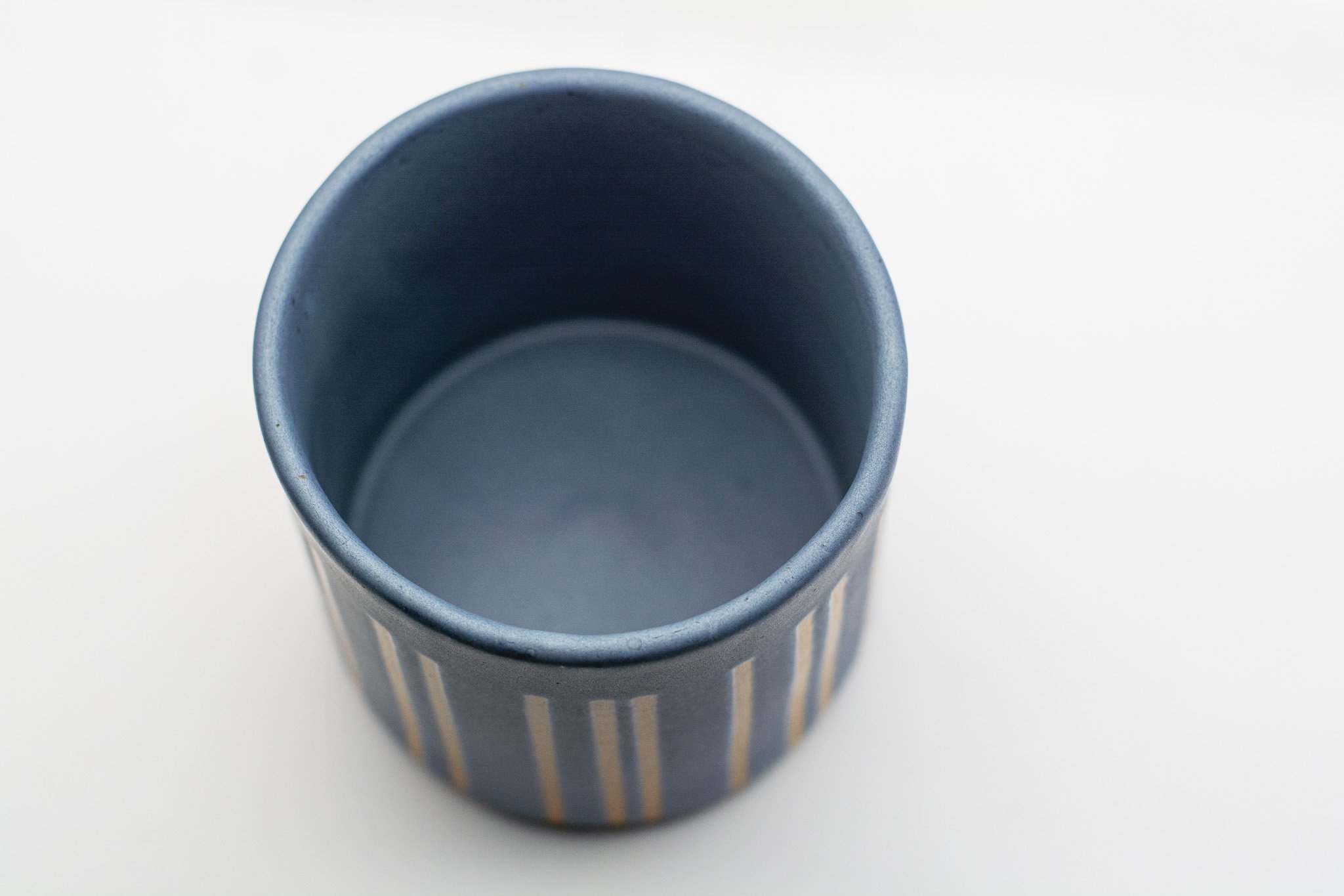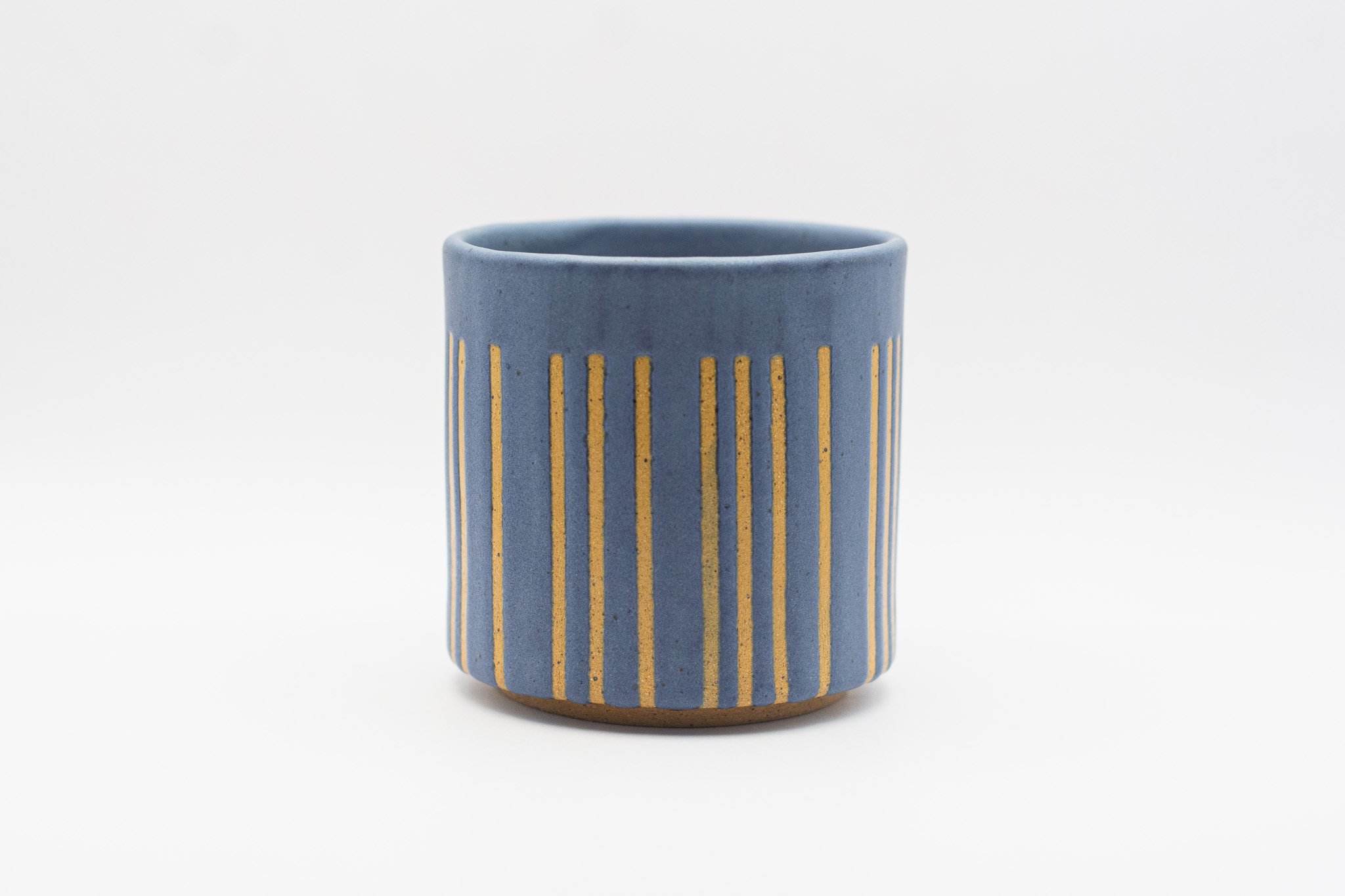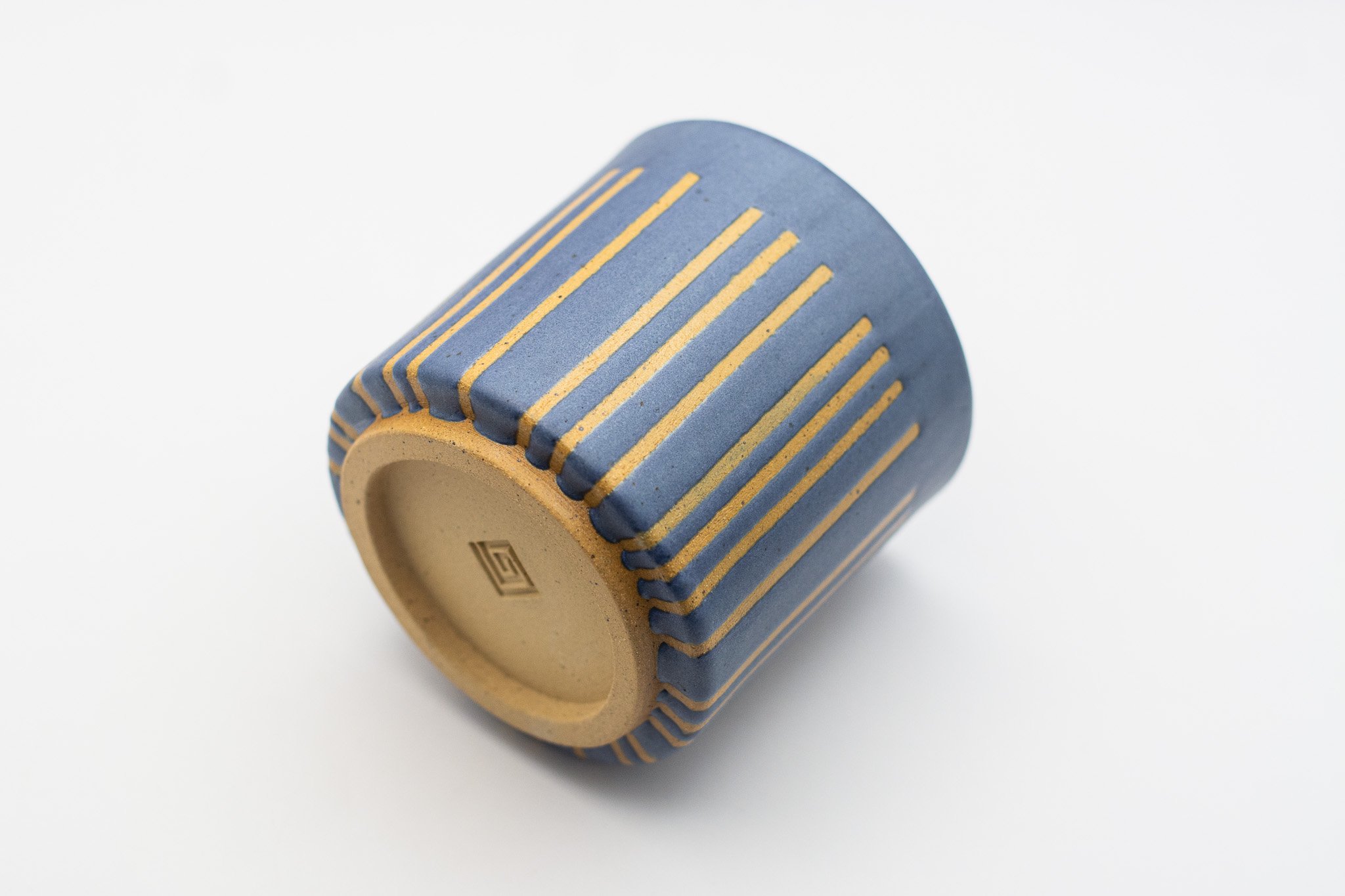 A large ceramic tumbler characterized by its fine strips of exposed speckled clay, matte blue glaze and thick foot ring.