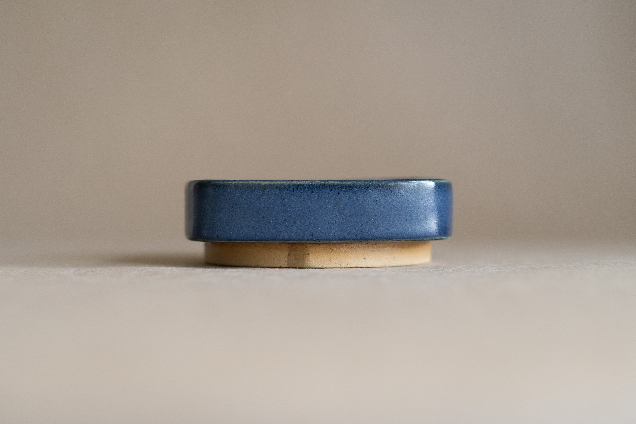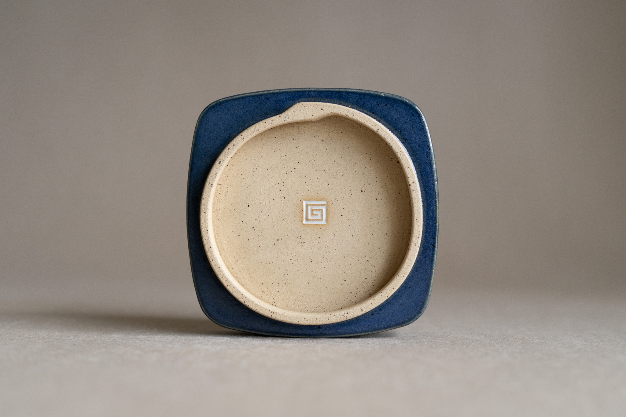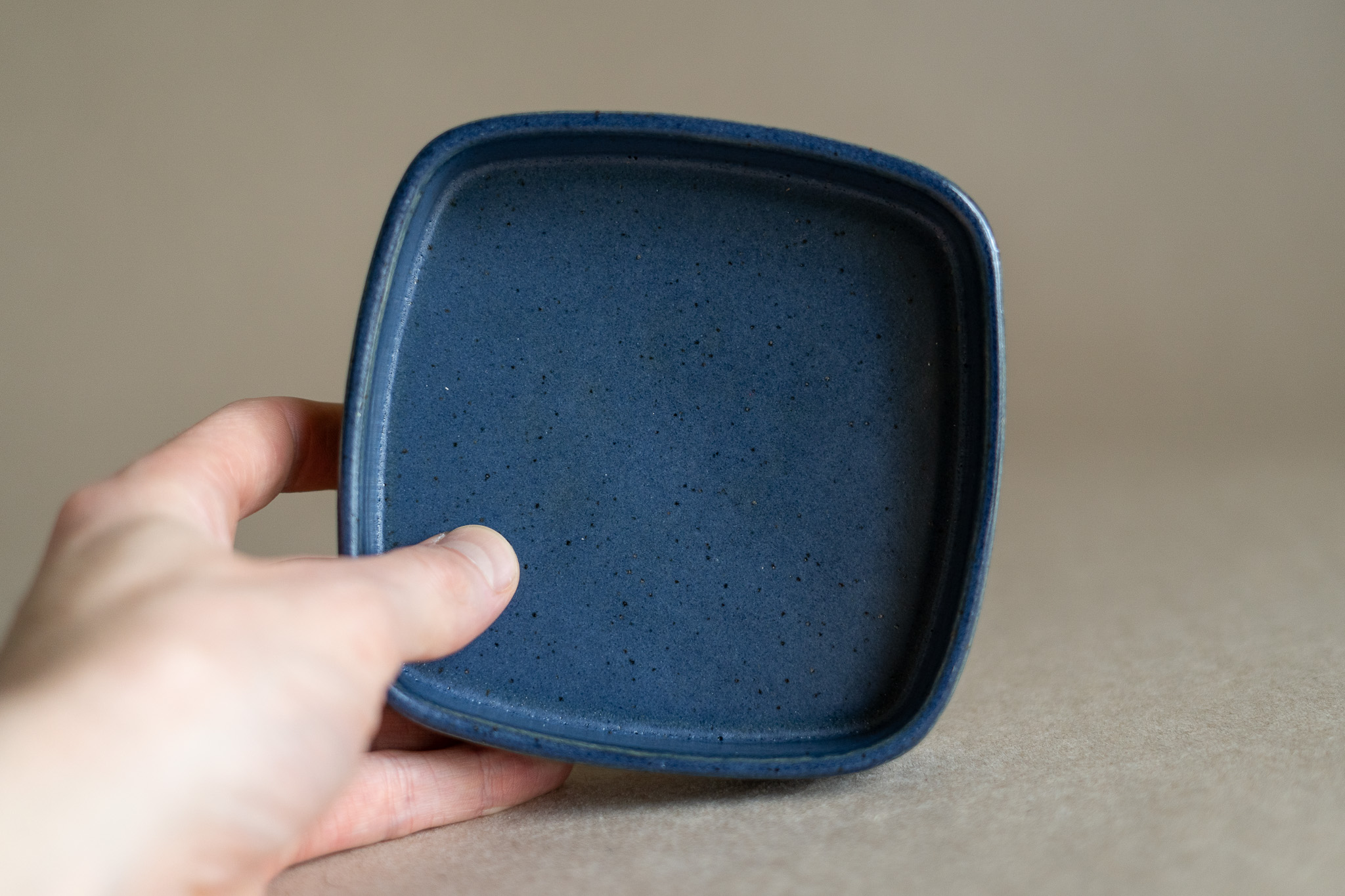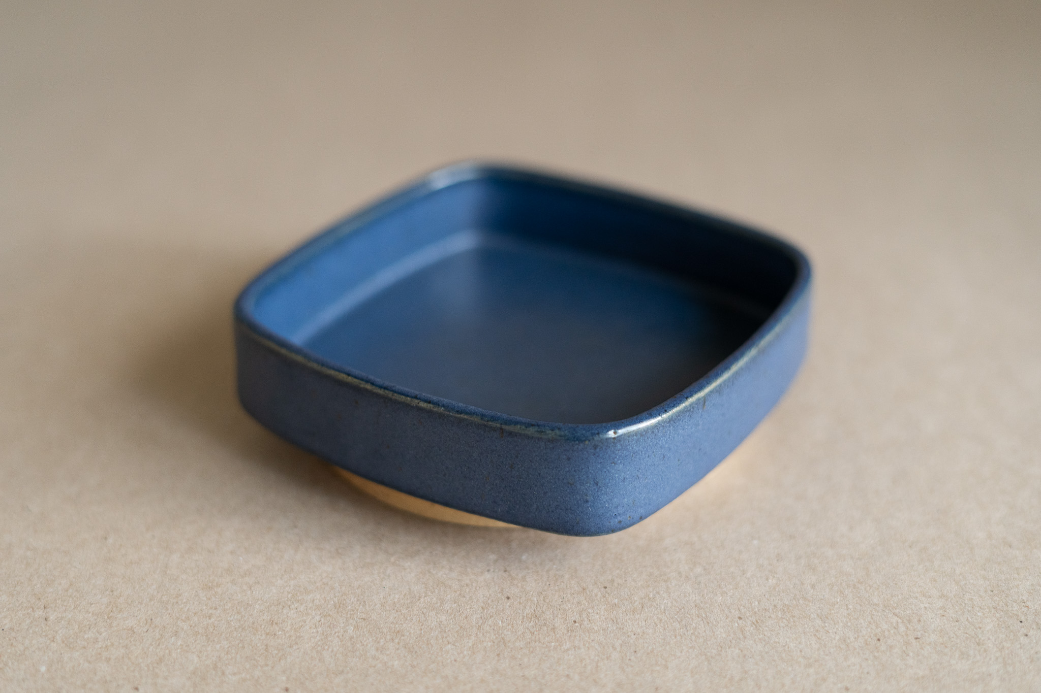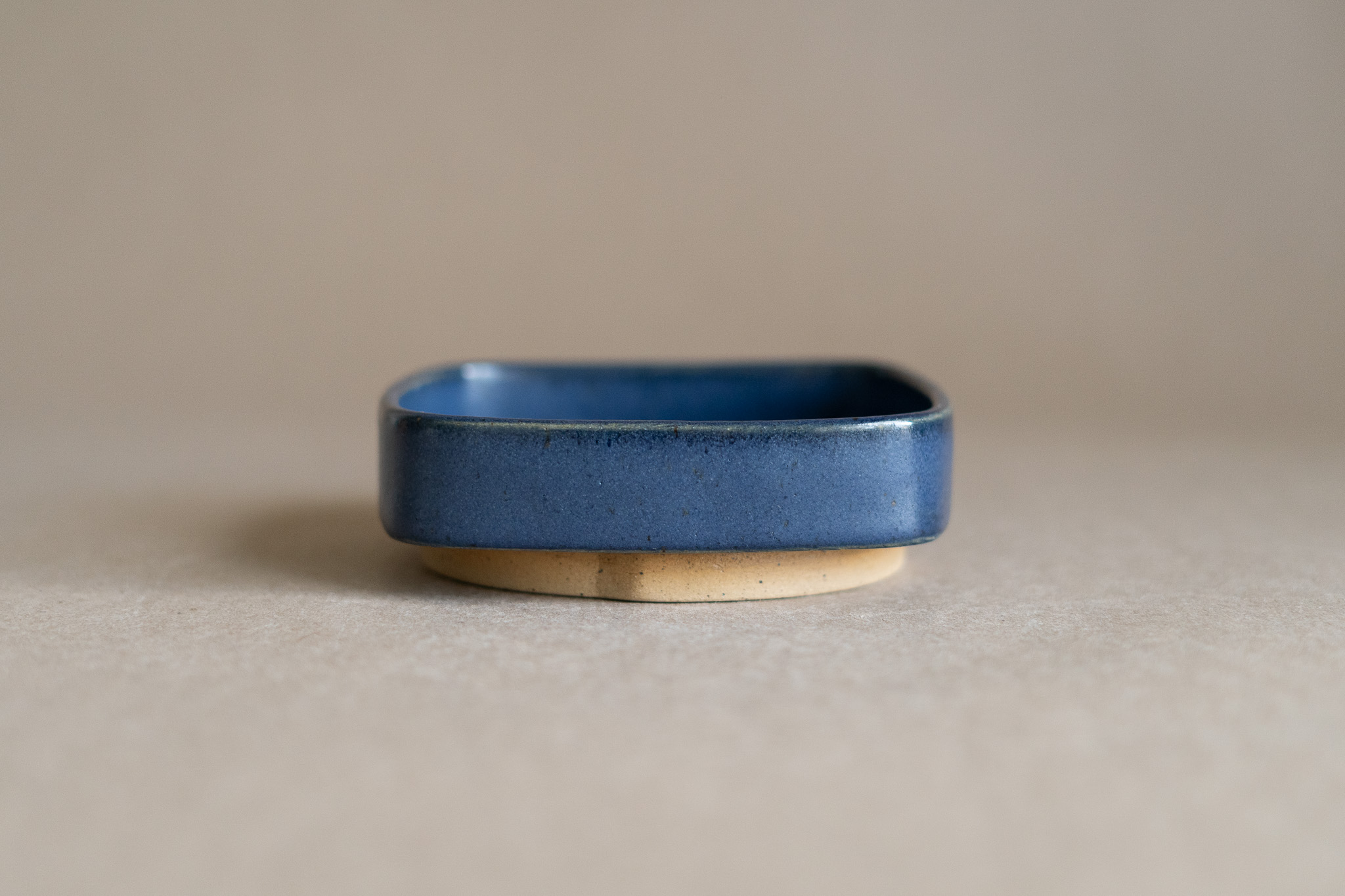 A small-sized ceramic tray characterized by its rounded square form, tall vertical rim, matte navy blue glaze and tall foot ring. It could be used for many different purposes, such as holding your favourite snack or organizing bathroom products.