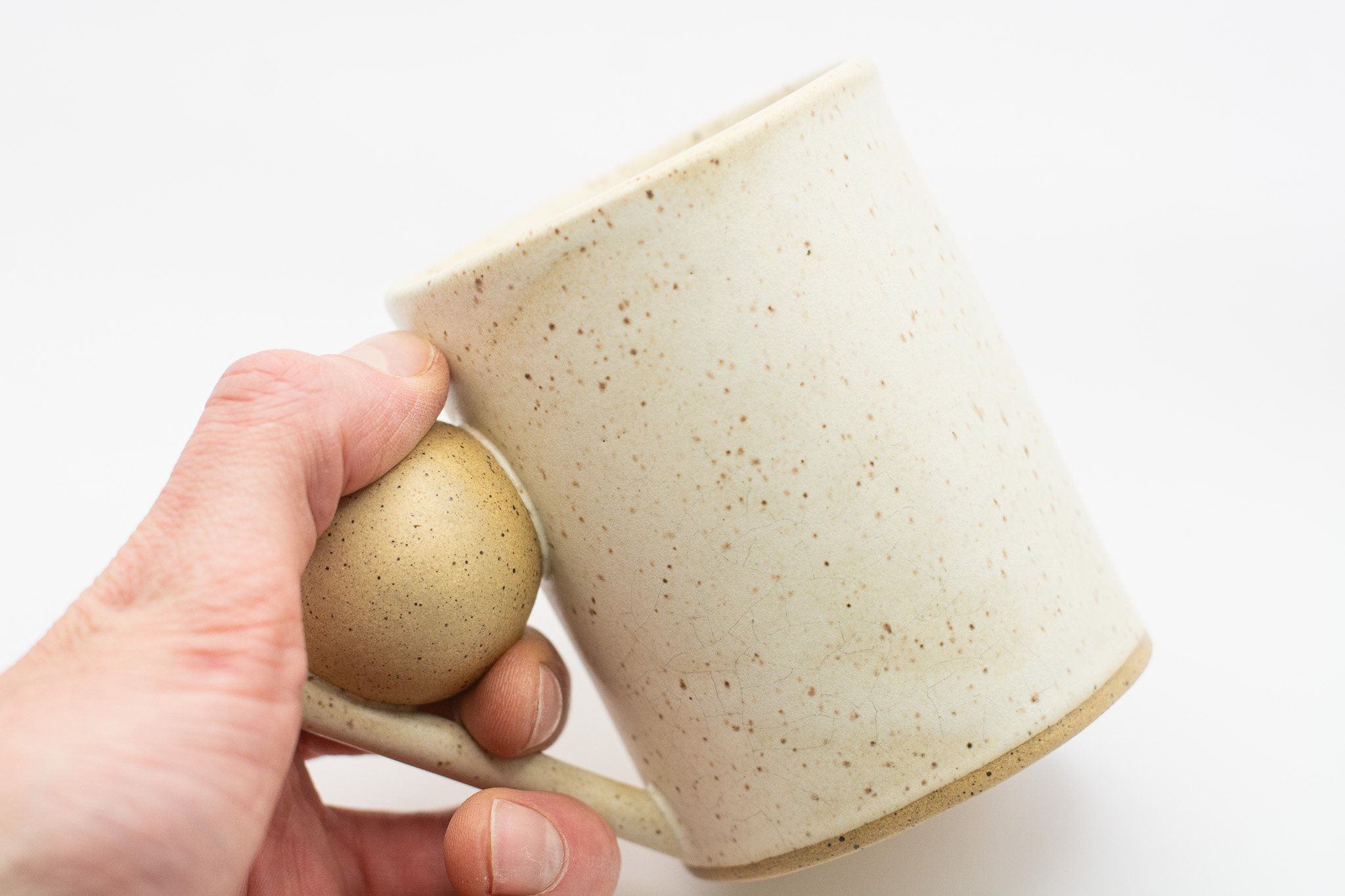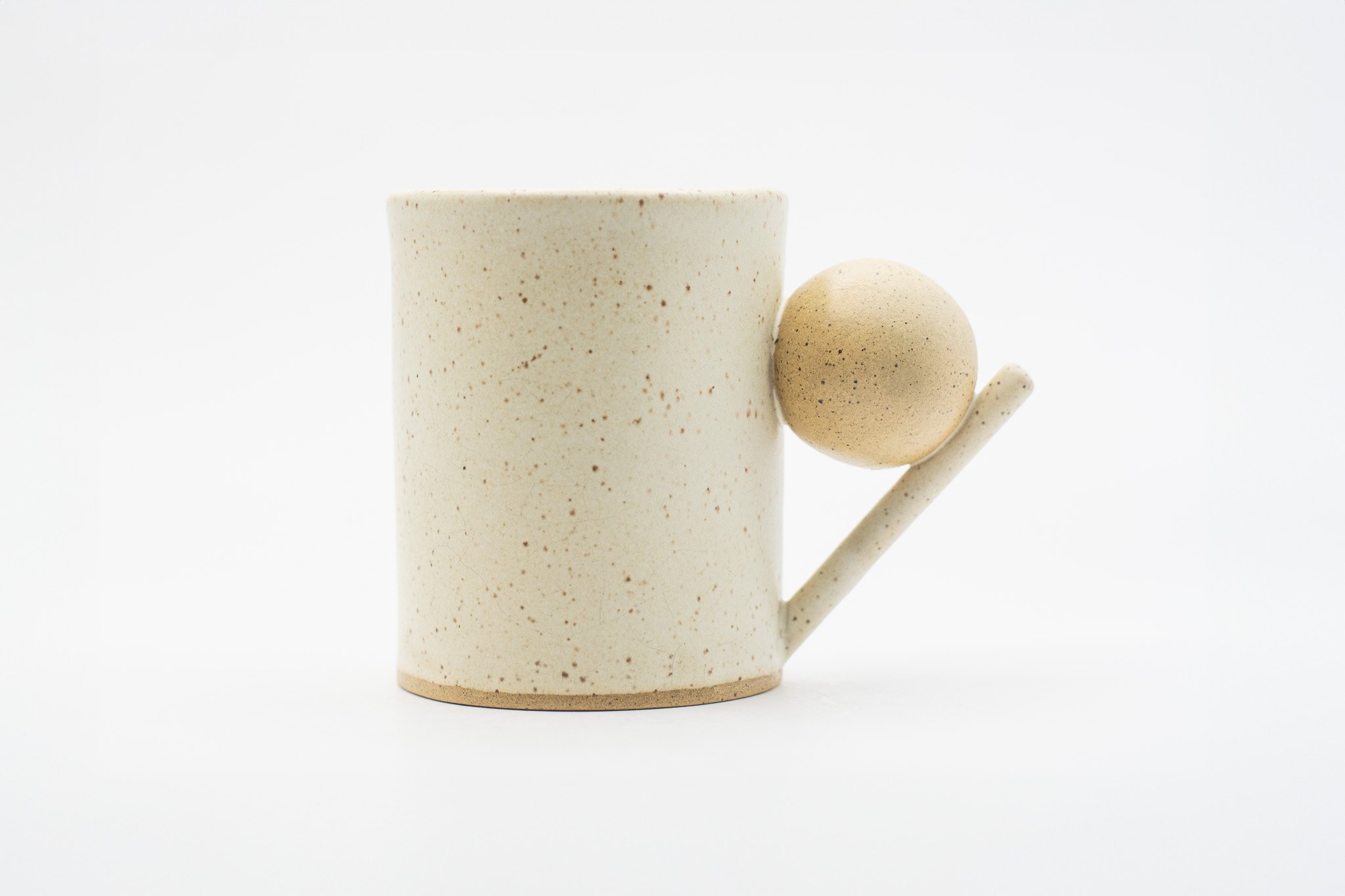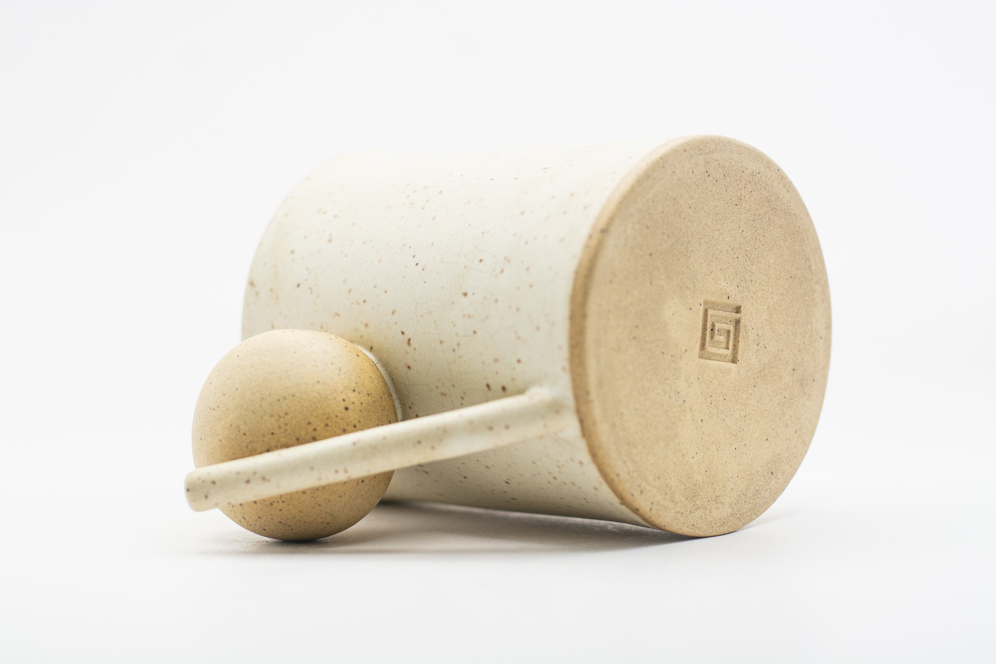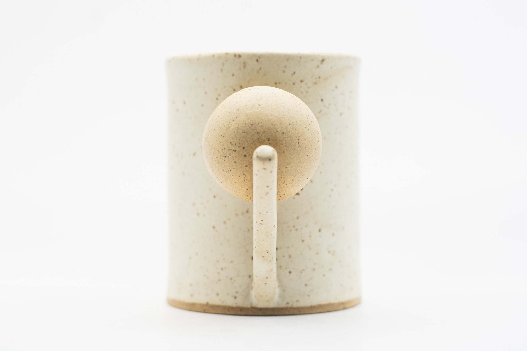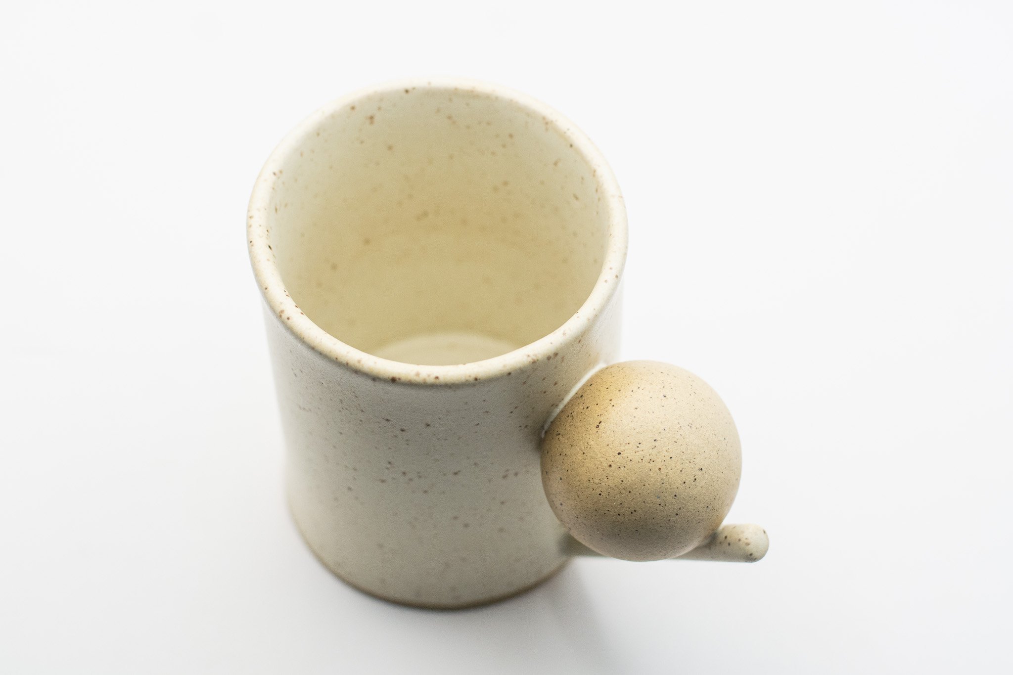 A medium sized mug characterized by its unglazed hollow ball handle and speckled clay body. The galze is a matte white colour and has some subtle crazing.