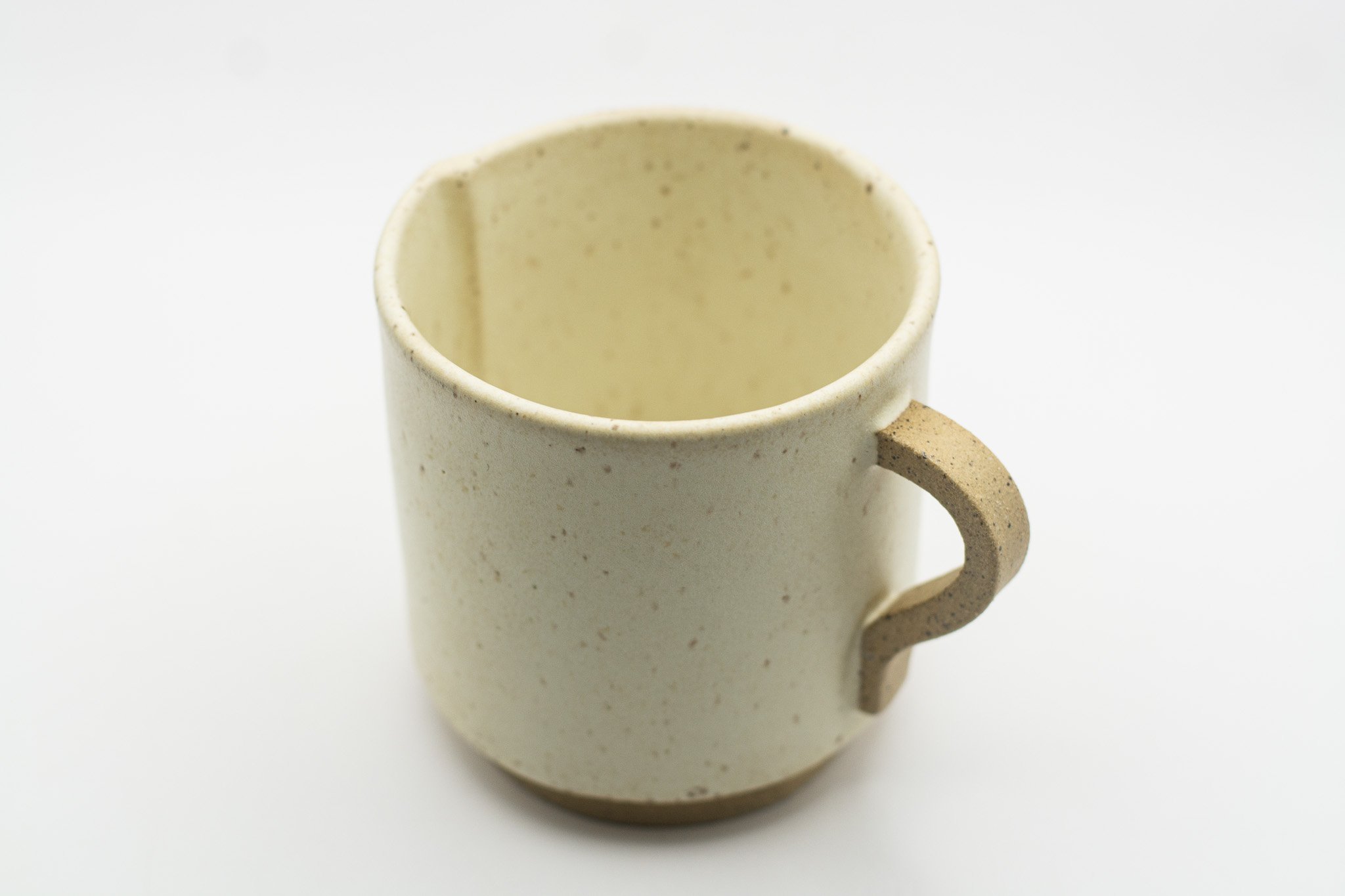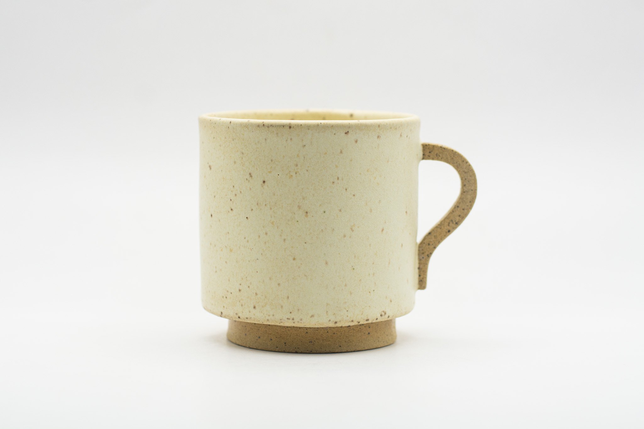 A set of 2 medium sized mugs, characterized by their matte white glaze and unglazed handle and foot ring.