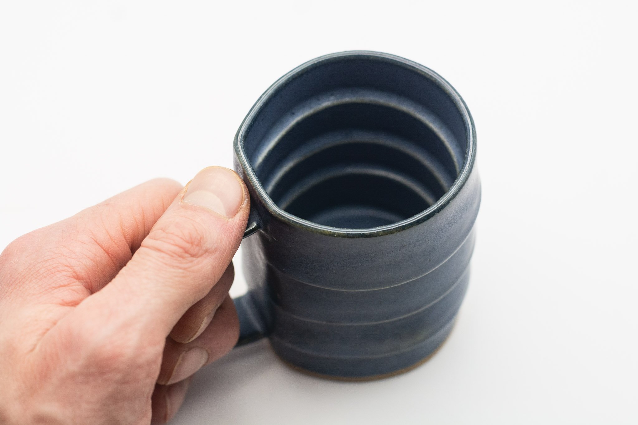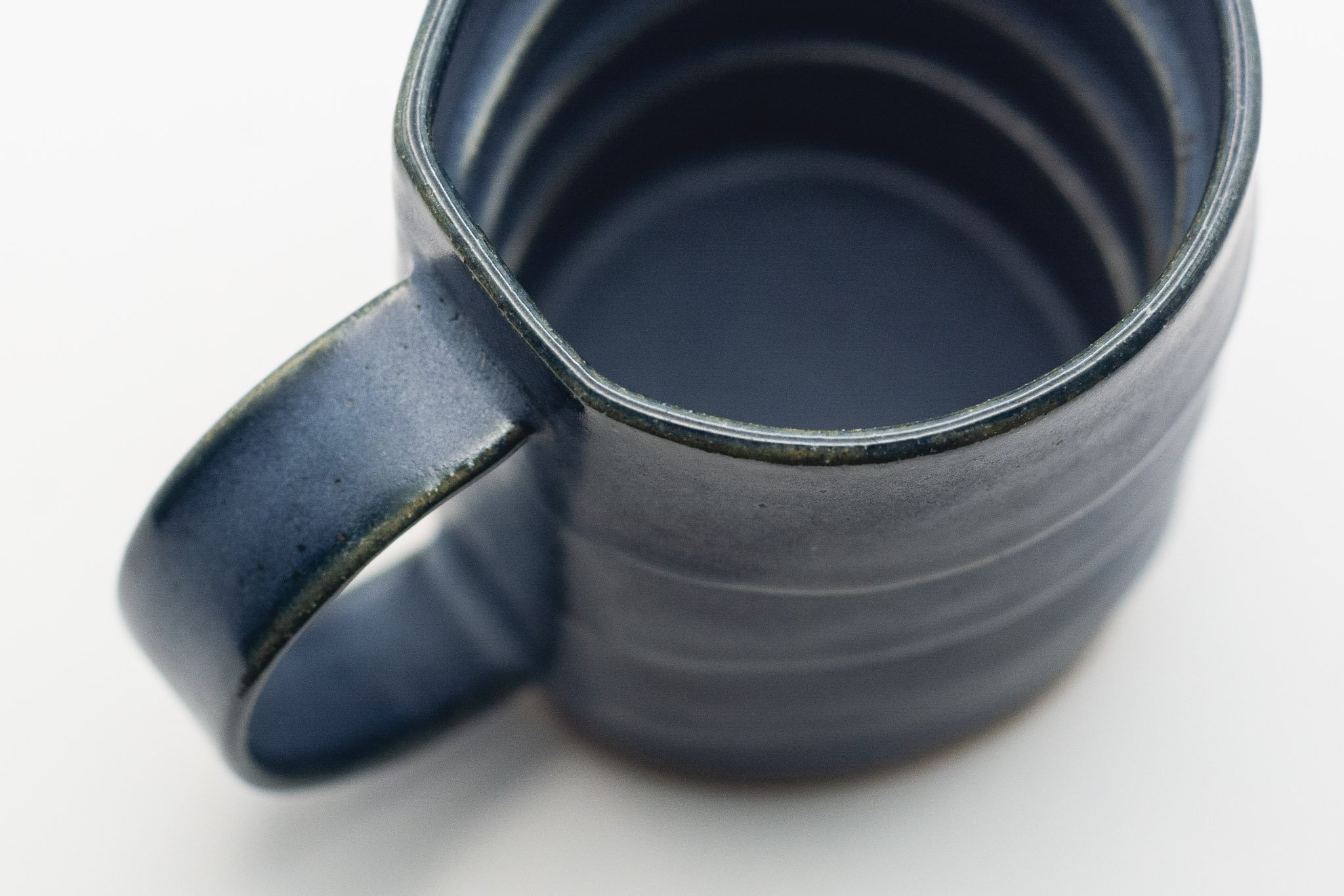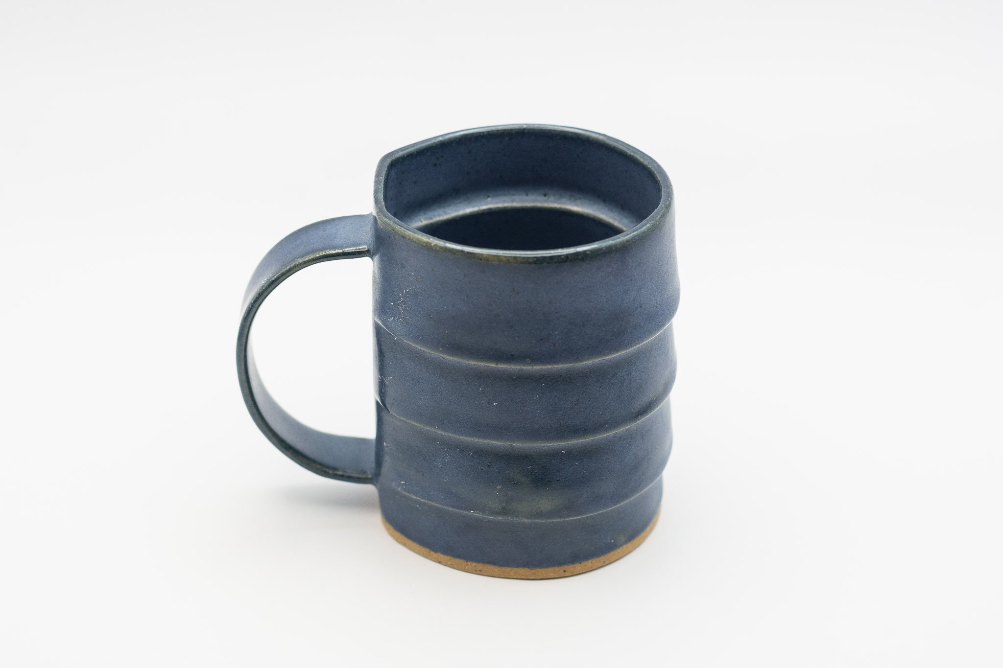 A small mug characterized by its overlapping layers, delicate handle and dark blue glaze.