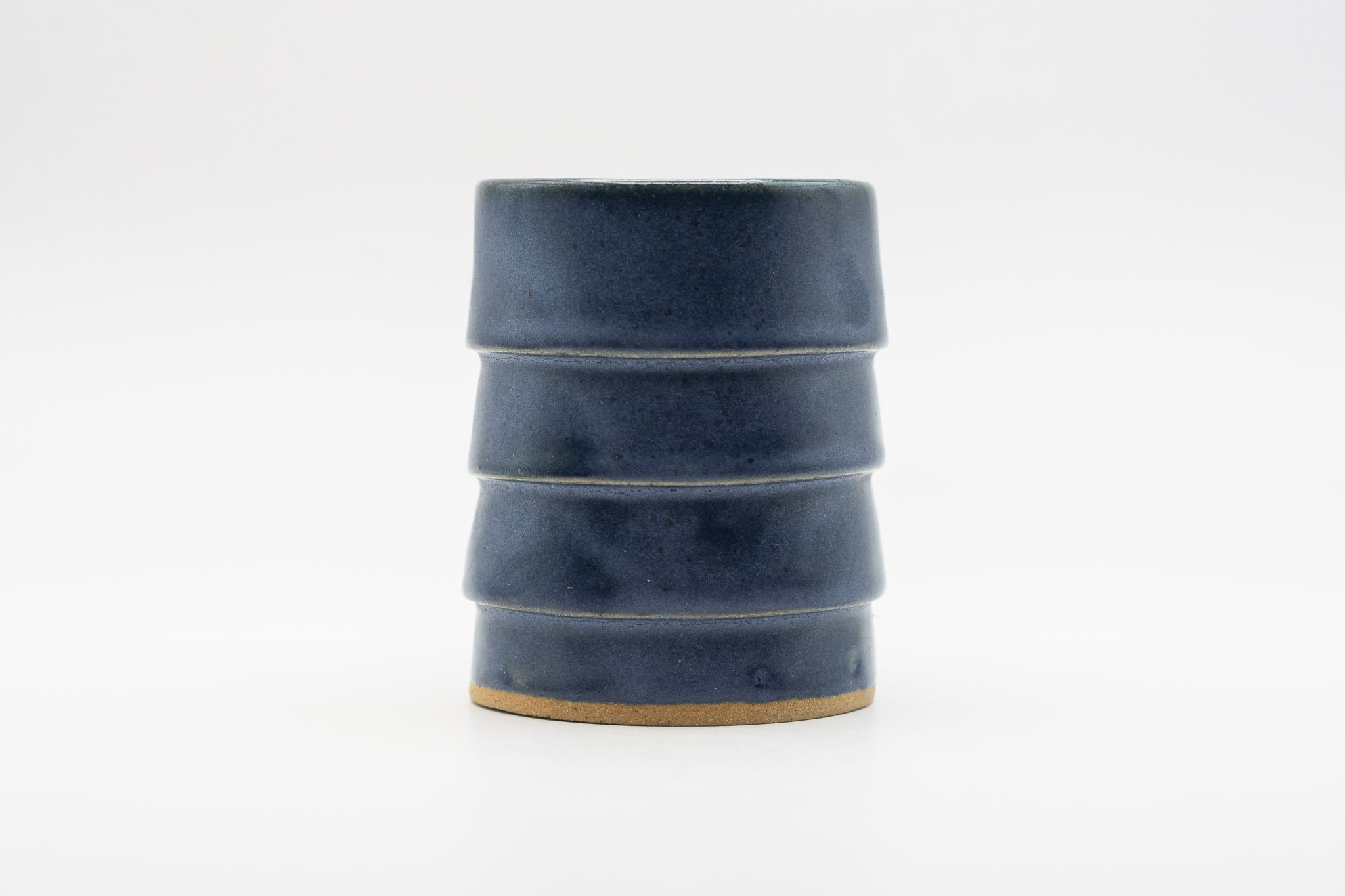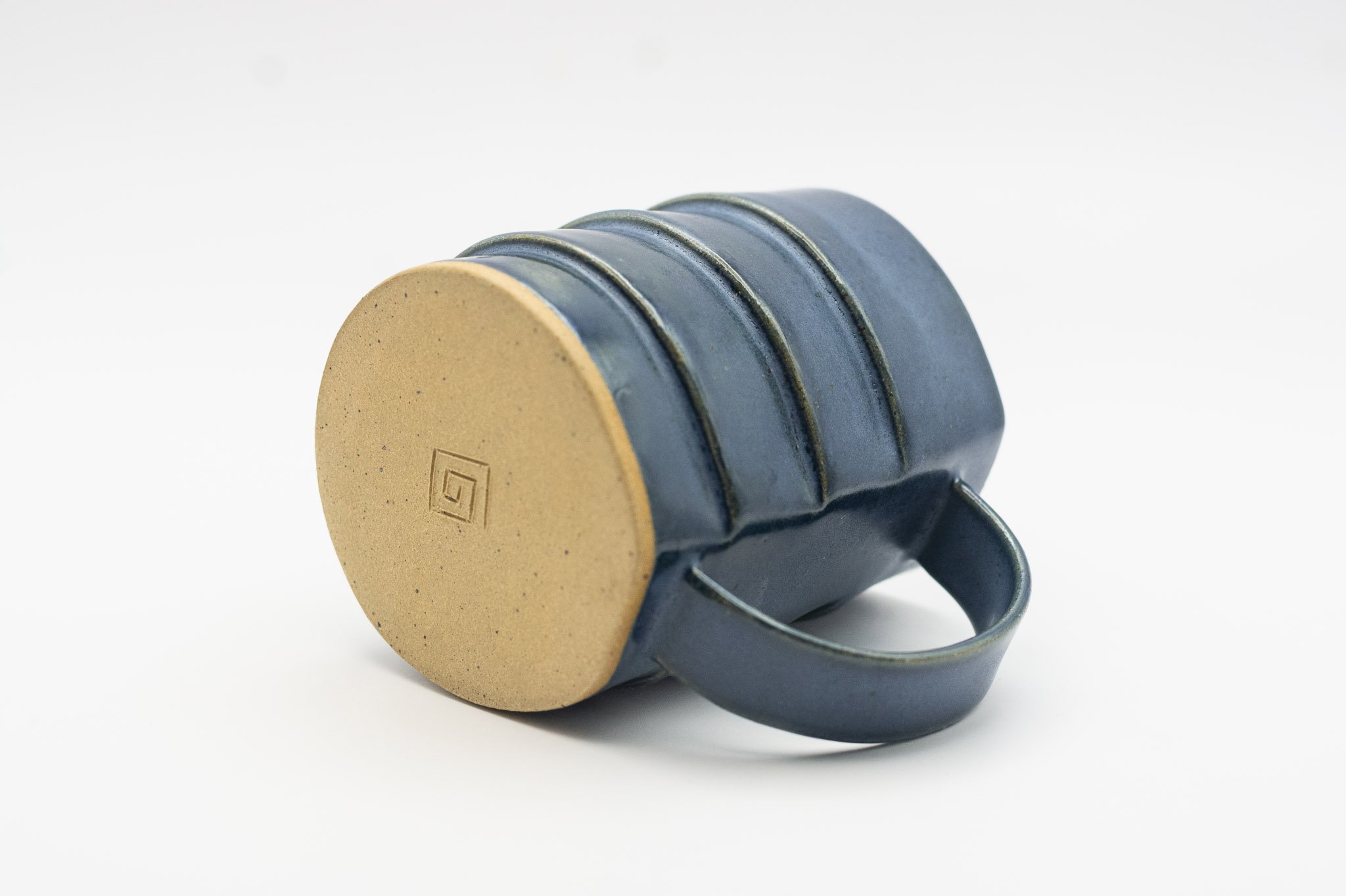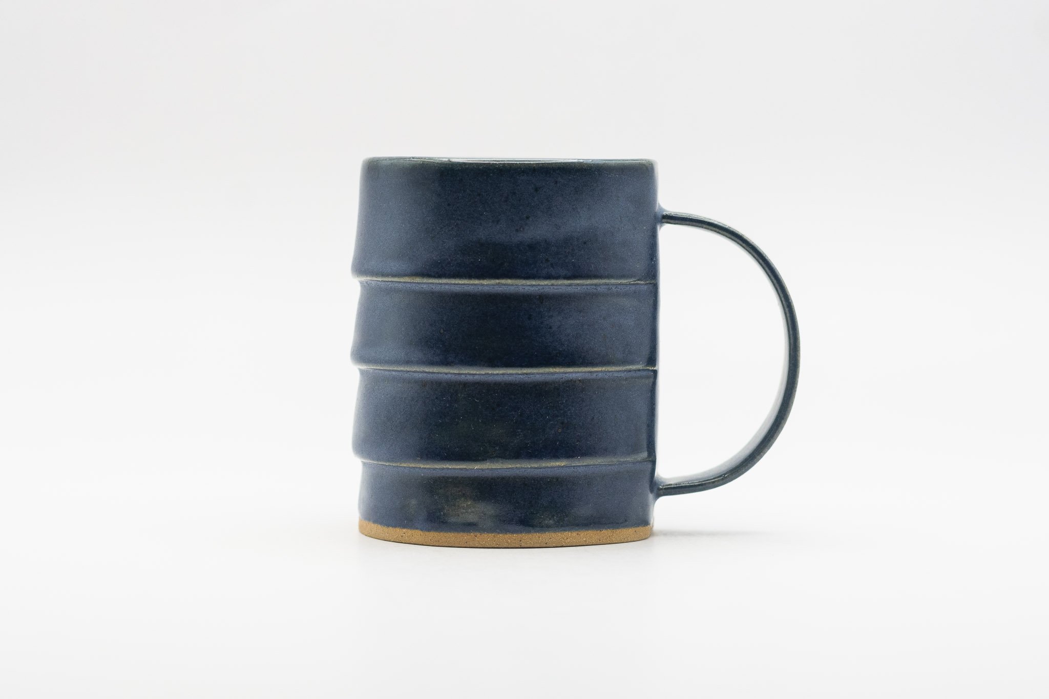 A small mug characterized by its overlapping layers, delicate handle and dark blue glaze.