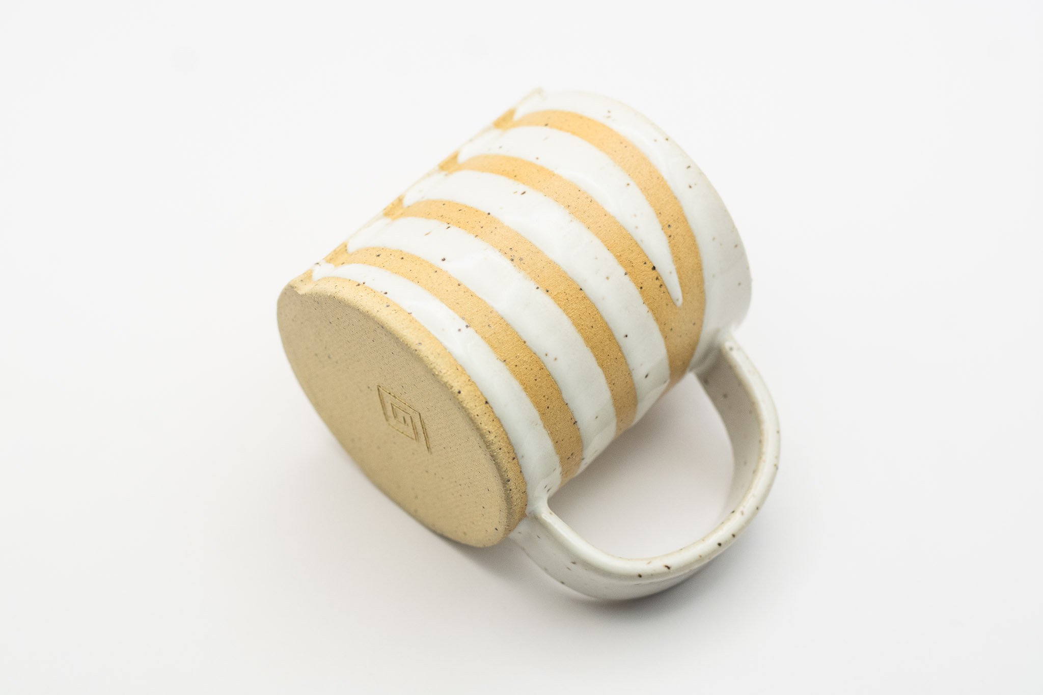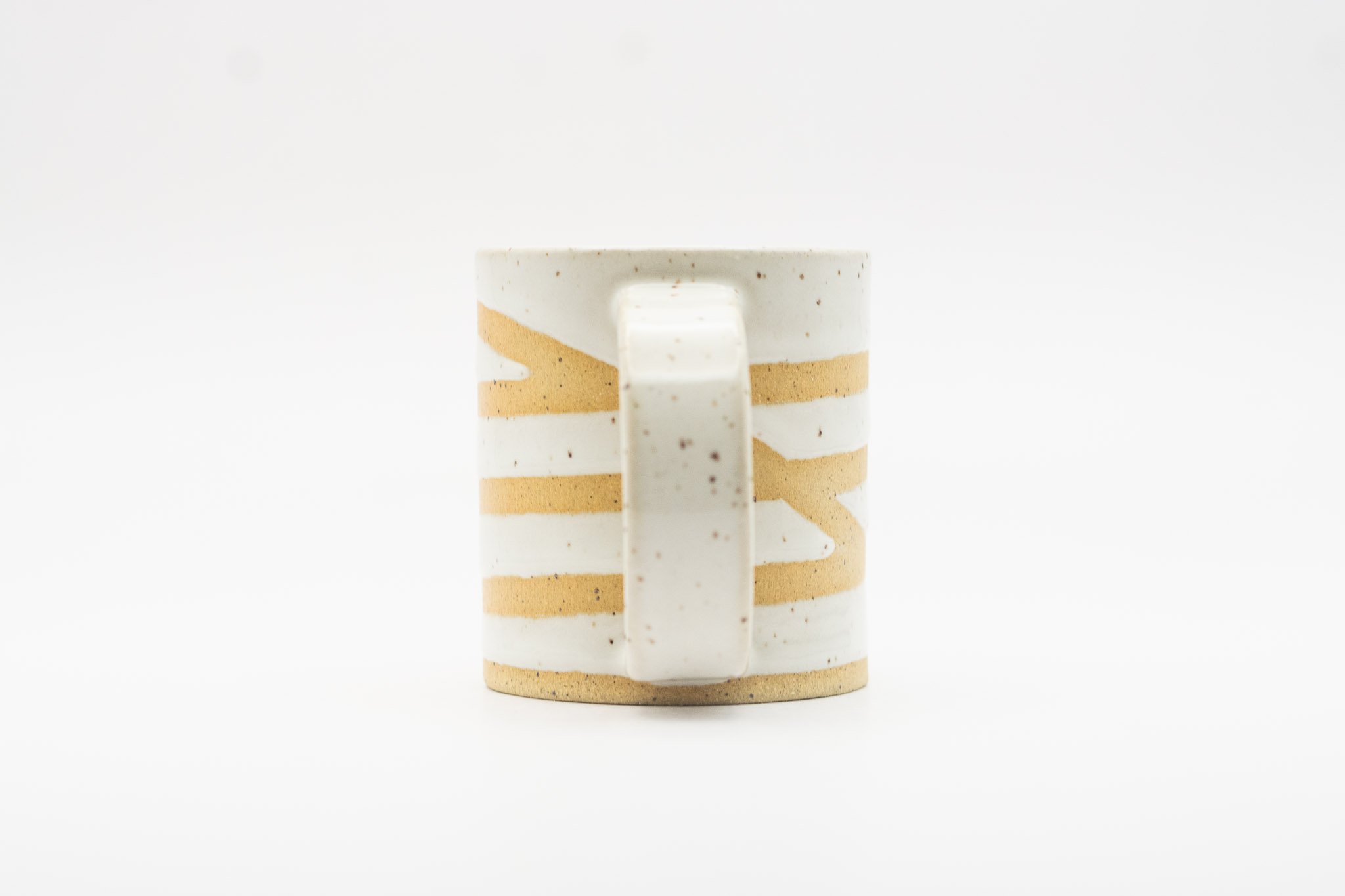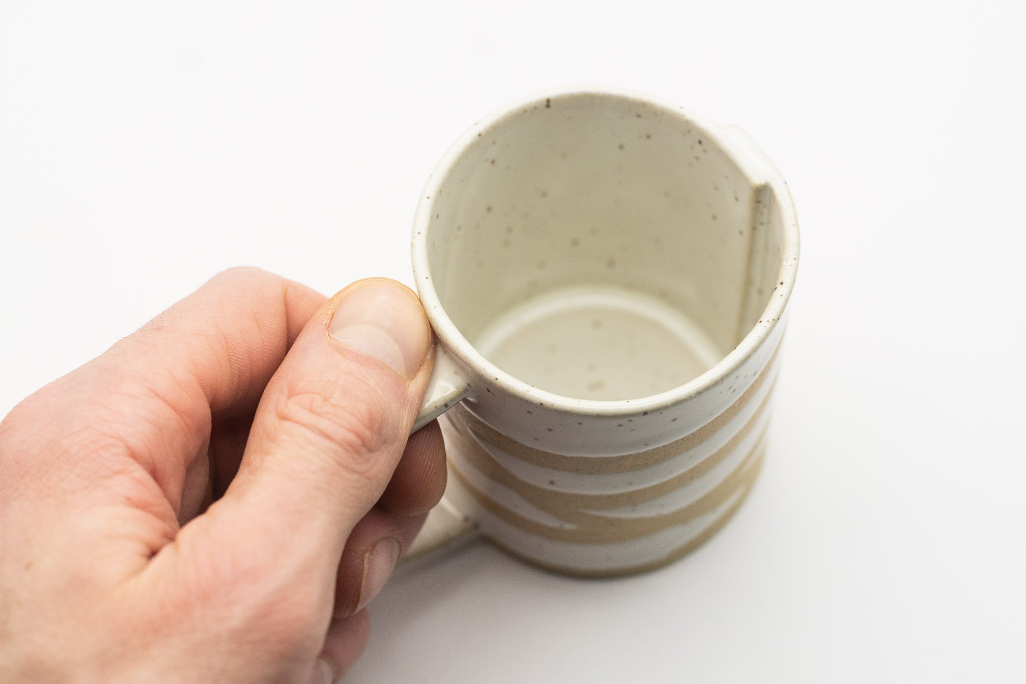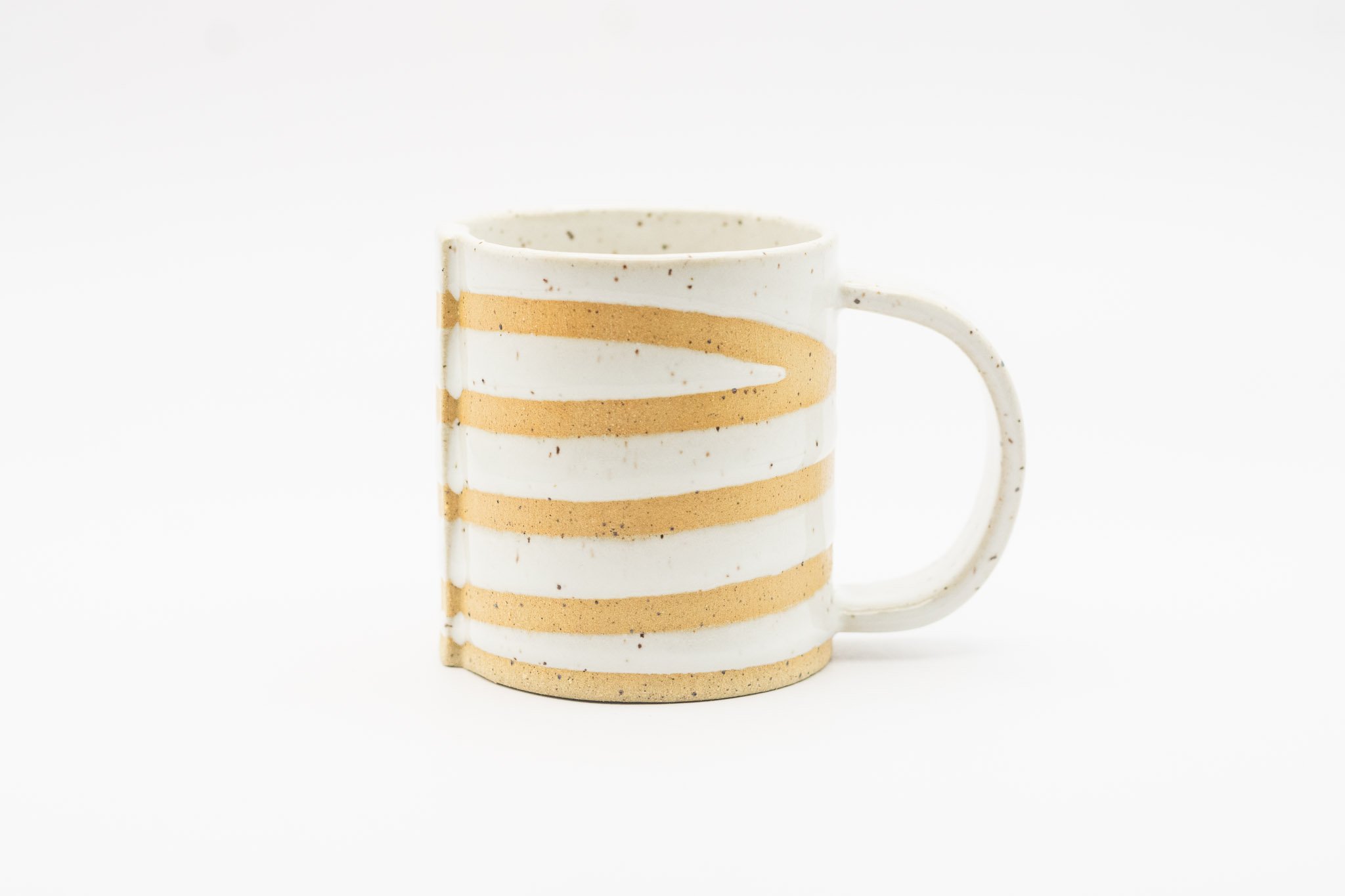A small sized handled mug characterized by its delicate form, spiraling white glaze and raw speckled clay.
