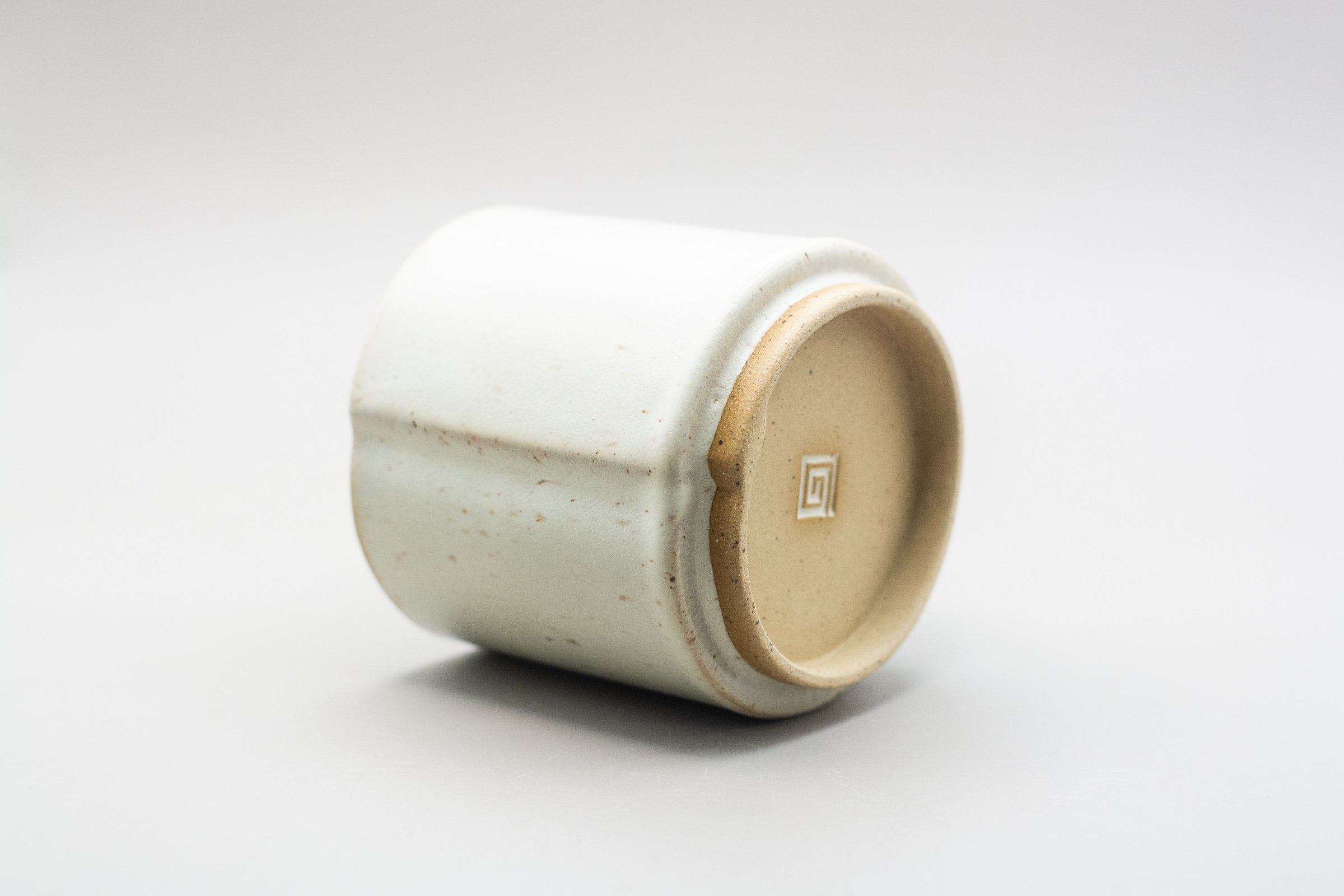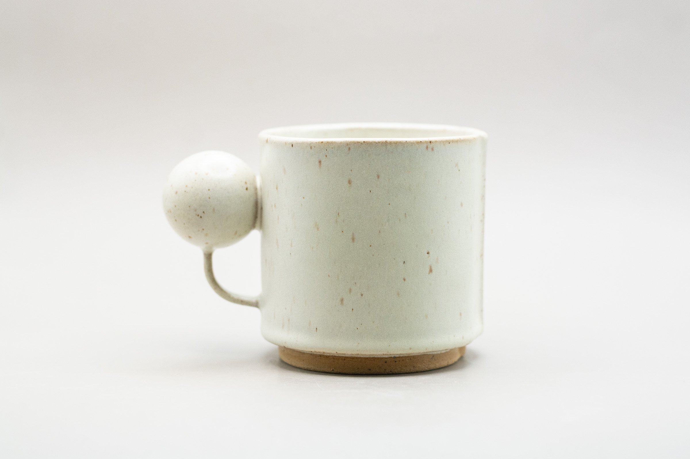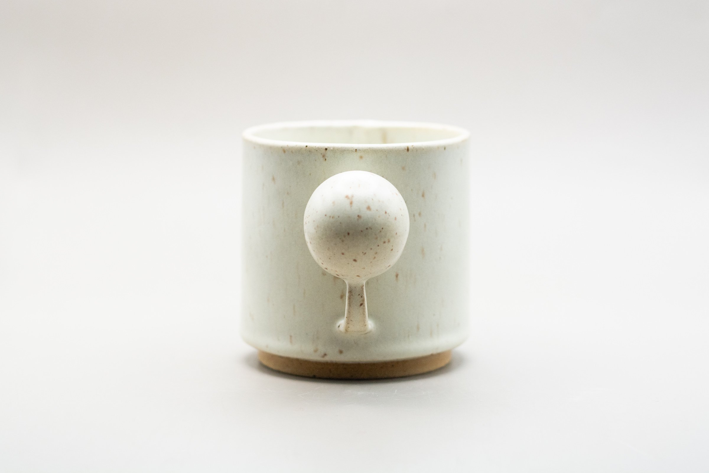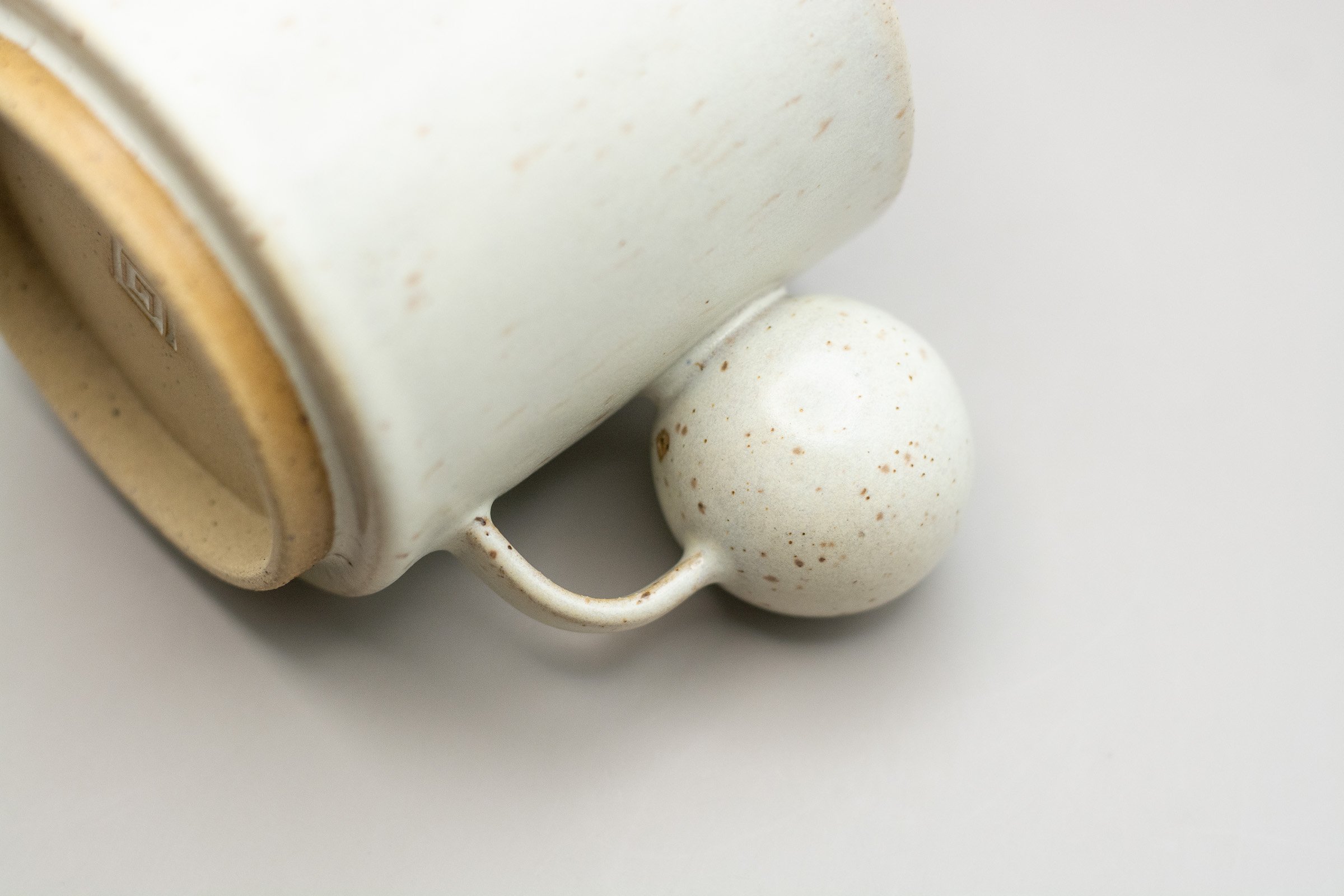 A medium sized mug characterized by its hollow spherical handle, matte white glaze, speckled clay body and tall foot ring.