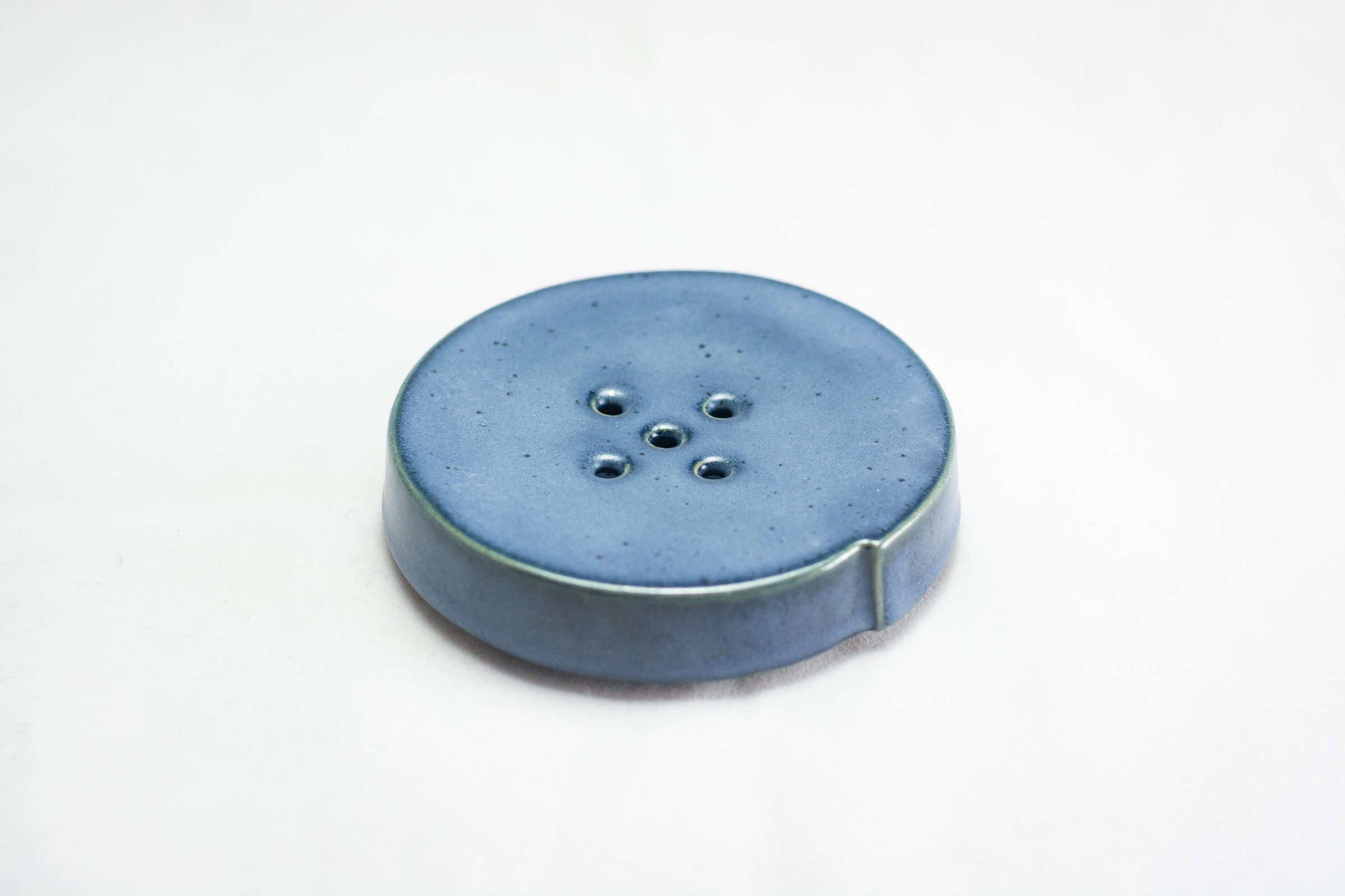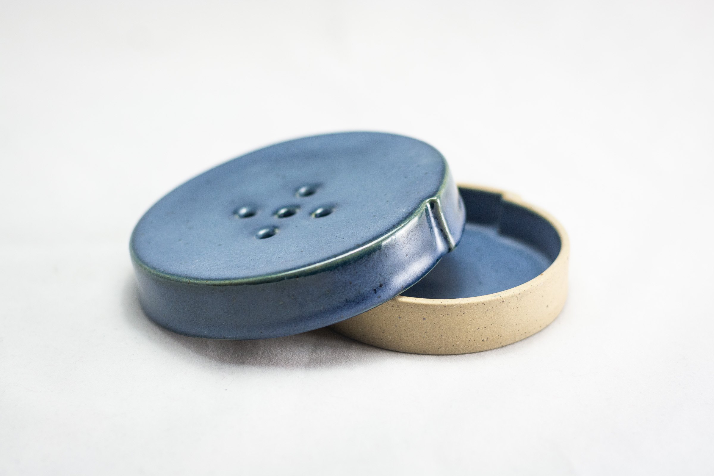 A two-piece soap dish characterized by its 5 hole pattern, satin navy blue glaze and speckled clay body. The top piece sits on top of a matching drip tray, giving off the effect that the soap dish is levitating.