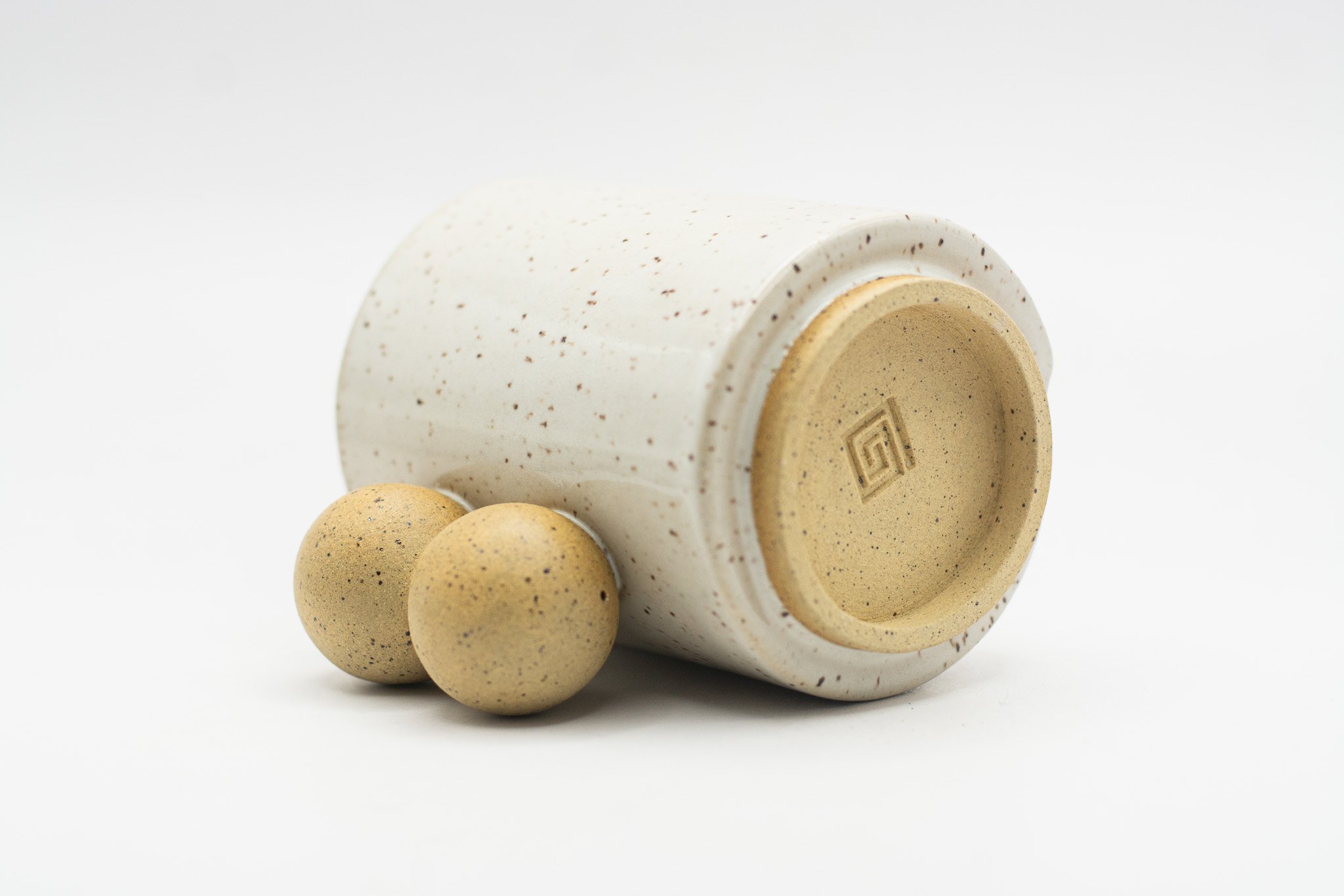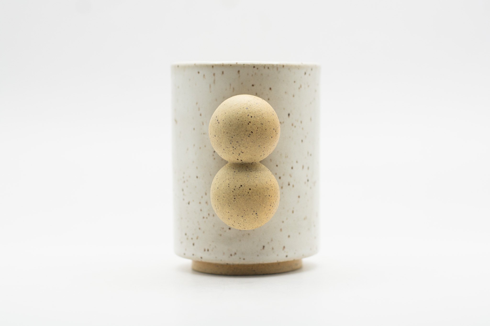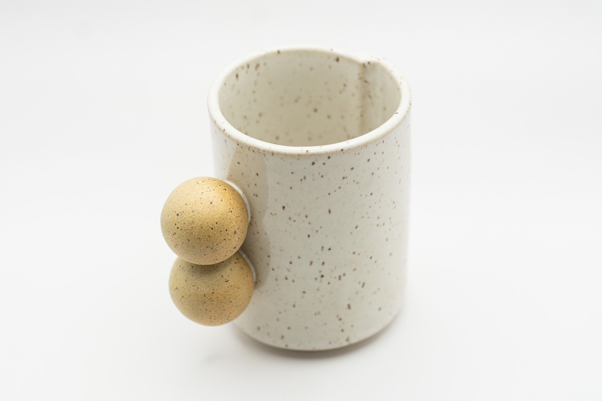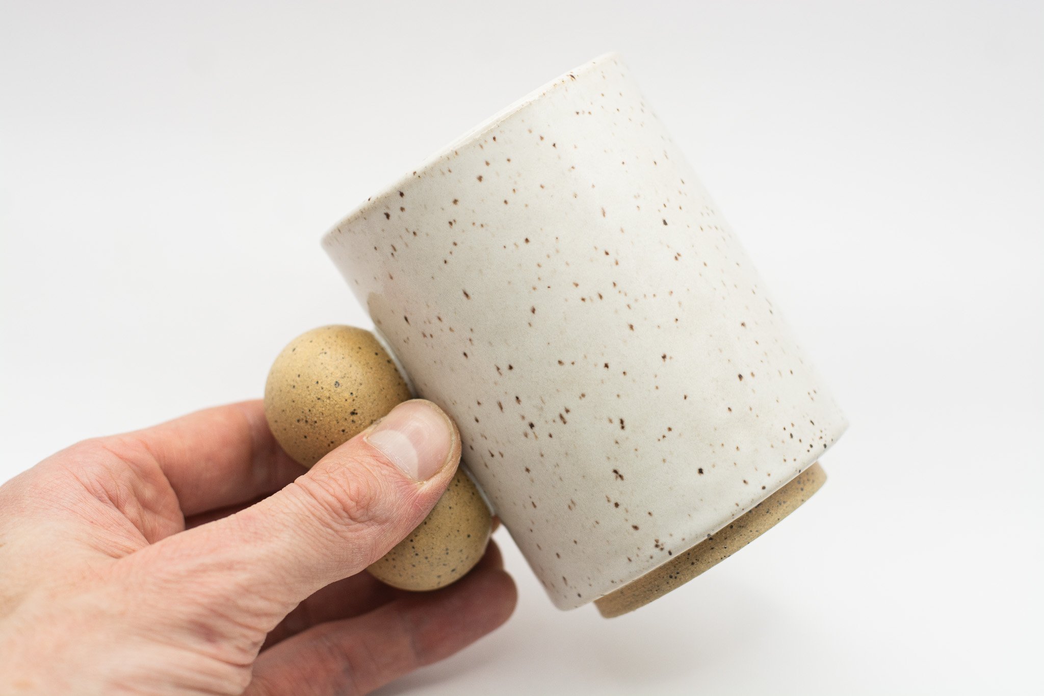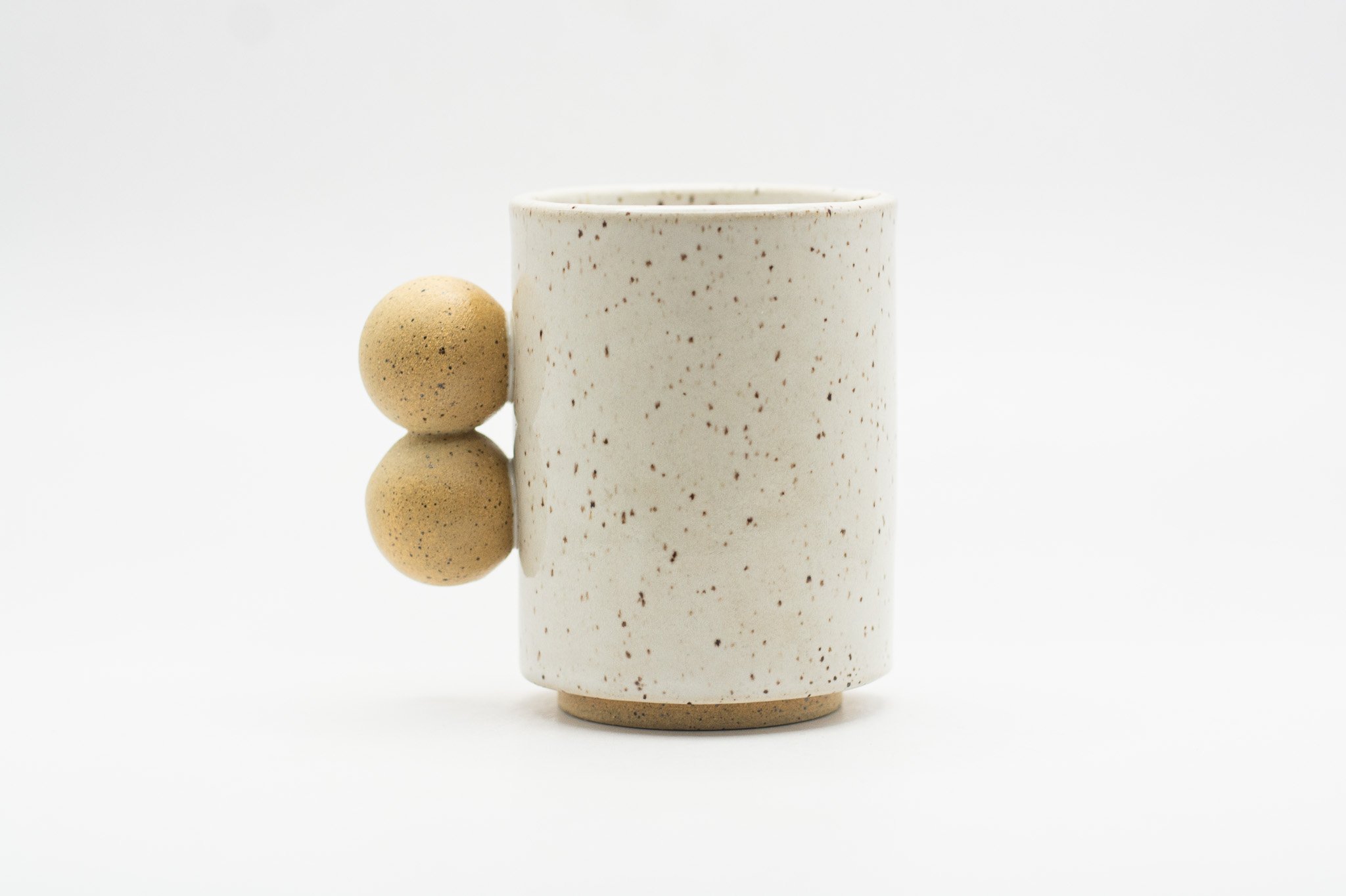 A small mug characterized by its unglazed double ball handle, white glaze, speckled clay body and tall foot ring.